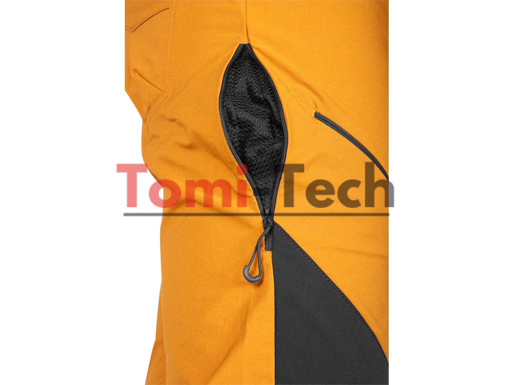 Pracovné nohavice OUTDOOR vyrobené zo 4-cestnej strečovej tkaniny, zloženie materiálu: 92% nylon, 8% spandex, gramáž: 230g/m2, horčicová farba s tmavosivými vložkami, prídavný panel v rozkroku pre väčšie pohodlie, 4 vrecká na zips na stehnách, tvarované kolená vpredu, vetranie v spodnej časti nohavíc, ploché vrecká s dodatočnými záševkami vzadu, vetranie v šve pod kolenom, potlačené logo na pútku na opasok, menovka, balenie: recyklované plastové vrecko, jedinečný vlastný dizajn, certifikát CE, veľkosť MDodatočné parametre