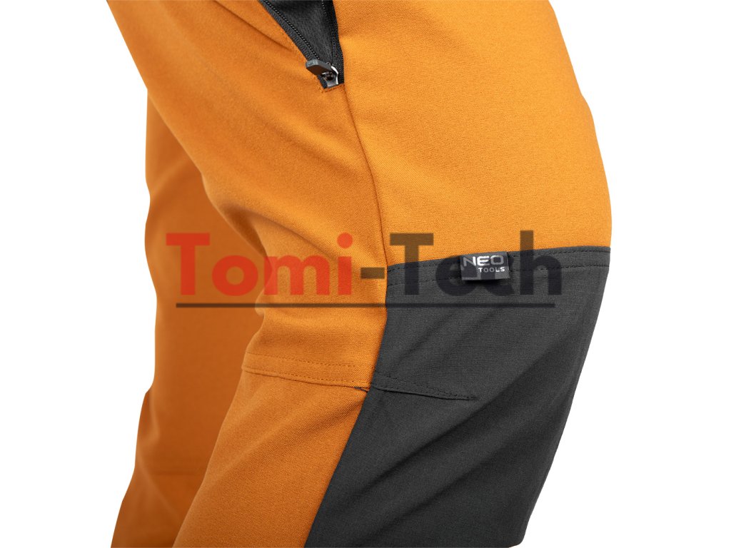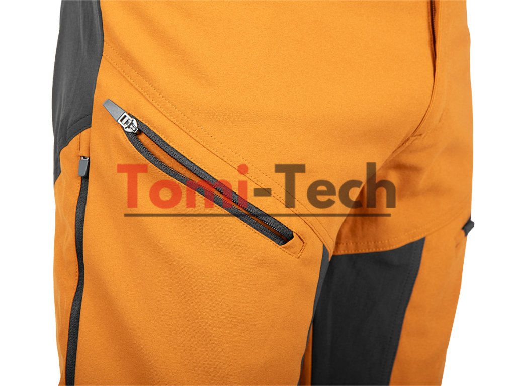 Pracovné nohavice OUTDOOR vyrobené zo 4-cestnej strečovej keprovej tkaniny, zloženie materiálu: 100 % rýchloschnúci polyester, gramáž: 210 g/m2, v horčicovej farbe s tmavosivými výložkami na zadnej strane stehien a kolená, predné vrecká na zips, vetranie v bočnom šve, tvarované kolená, nastaviteľný obvod nohavíc pomocou suchého zipsu a zipsu, menovka, štítok s logom nad kolenom, veľkosť XLDodatočné parametre