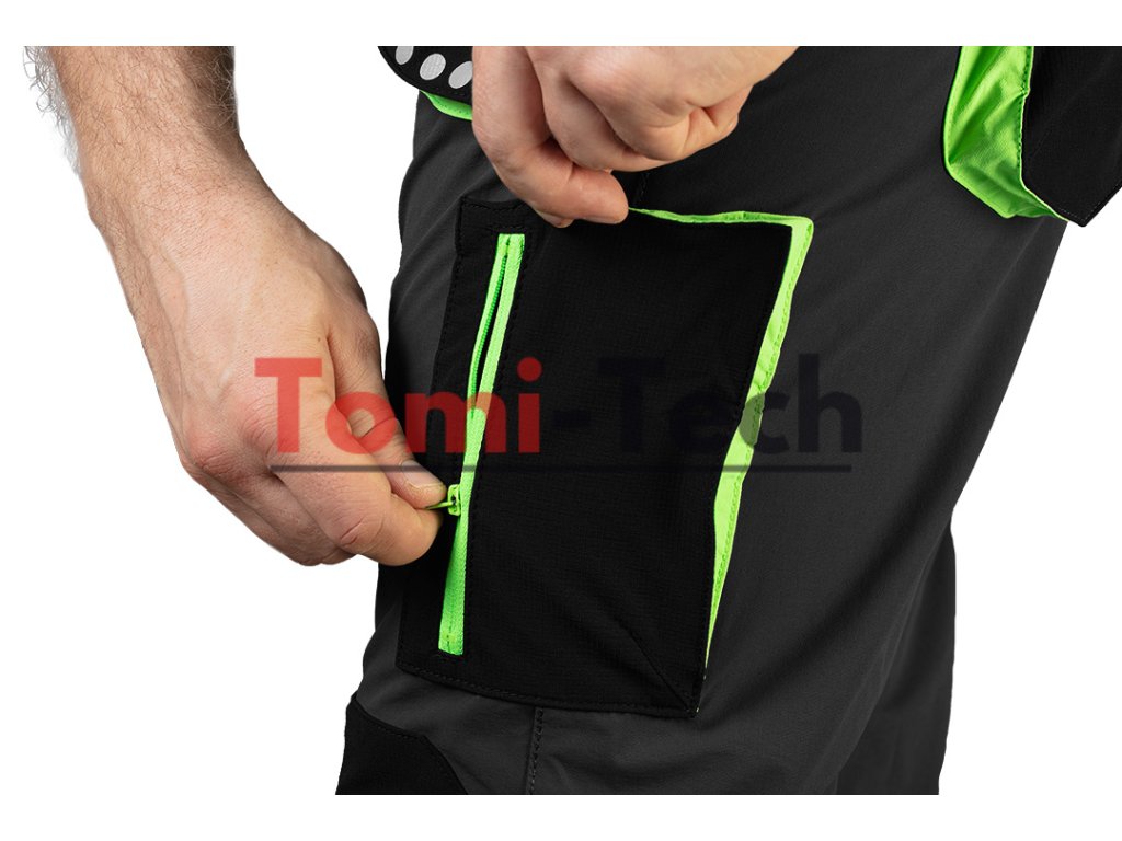 Pracovné nohavice PREMIUM, strečové v 4 smeroch, čierne, zloženie: 90 % polyamid, 10 % elastan, gramáž: 170 g/m2, vyrobené zo strečovej tkaniny v 4 smeroch, ktorá funguje v štyroch smeroch, pre väčšie pohodlie a komfort, jedinečný vlastný dizajn, dodatočné výstuhy na kolenách a vreckách, multifunkčné a priestranné vrecká, profilované kolená, vnútorná menovka, nylonový opasok s plastovou prackou s vyrazeným logom, reflexné zóny, veľkosť XL, certifikácia CEDodatočné parametre