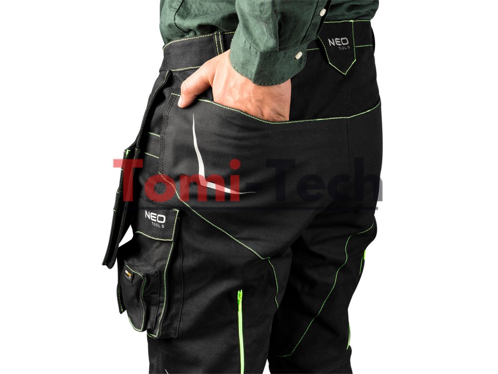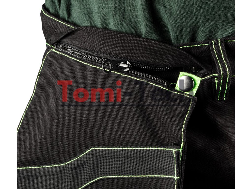 Pracovné nohavice PREMIUM PRO, čierne s neónovo zeleným prešívaním, zloženie hlavného materiálu: 100 % bavlna, plátno s gramážou 425 g/m2, zloženie materiálu výstuh: 75 % bavlna, 25 % nylon, Cordura NYCO s gramážou 272 g/m2, možné kombinovať s mikinou 81-214 a vytvoriť tak overal, 18 multifunkčných vreciek so zipsom alebo magnetickými cvočkami, vrecká na chrániče kolien, dvojito profilované kolená, výstuhy z Cordury NYCO na vreckách, kolenách a nohaviciach, trojité švy na nohaviciach, predĺženie dĺžky nohavíc o 4 cm, zipsy YKK, reflexné prvky 3M, vetranie na zadnej strane nohavíc, vnútorný elastický pás s protišmykovou potlačou, vnútorná menovka, jedinečný vlastný dizajn, certifikát CE, veľkosť MDodatočné parametre