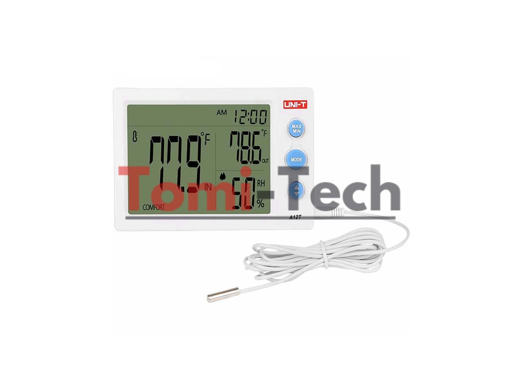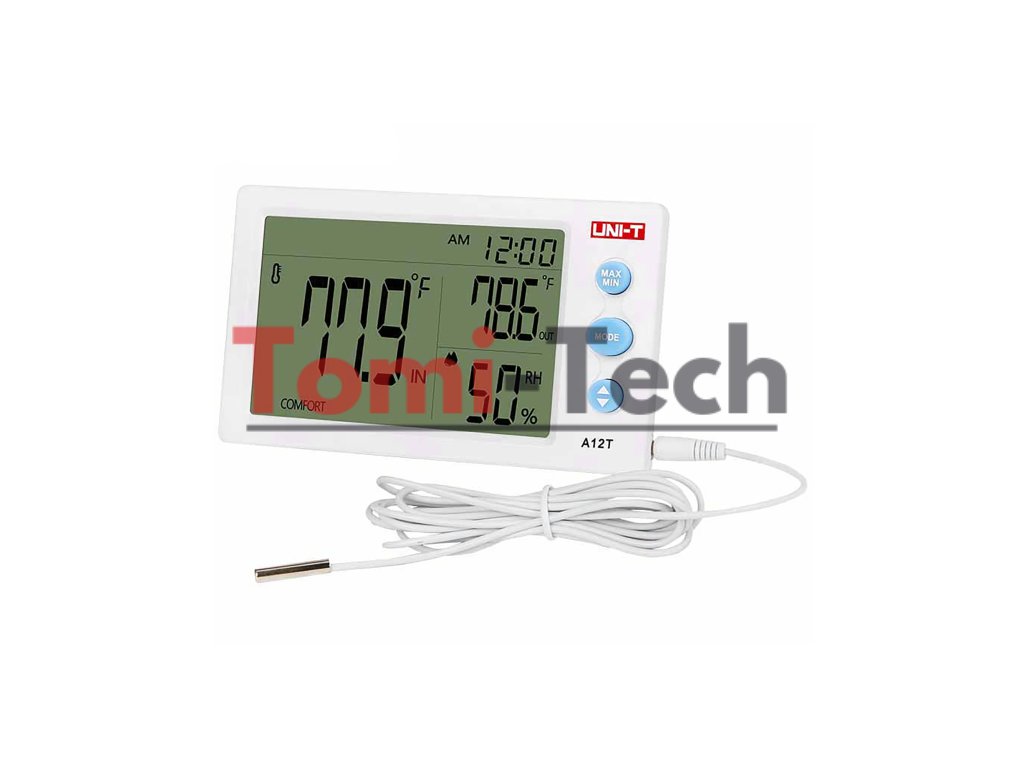 Uni-T A12T ponúka funkciu sledovania maximálnych a minimálnych hodnôt, čo umožňuje monitorovať extrémne podmienky. Vstavaný budík a hodiny, ktoré podporujú 12- a 24-hodinový formát, zvyšujú pohodlie používania. Externý káblový senzor vám umožňuje monitorovať teplotu a vlhkosť na rôznych miestach, čo vám poskytuje väčšiu flexibilitu pri riadení podmienok v rôznych častiach vášho domu alebo kancelárie.