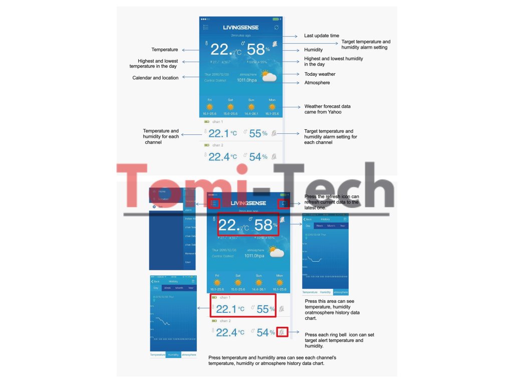 Meteorologickú stanicu je možné nakonfigurovať pomocou siete Wi-Fi, takže po nainštalovaní aplikácie do telefónu alebo tabletu môžete sledovať informácie poskytované stanicou v reálnom čase.
