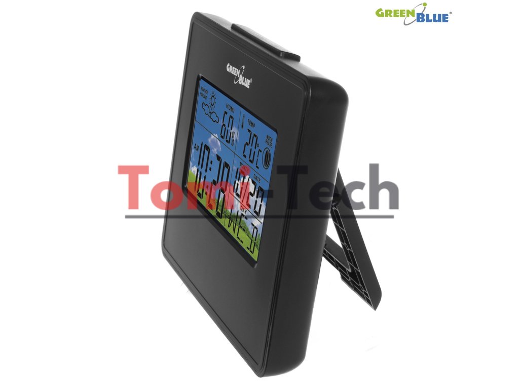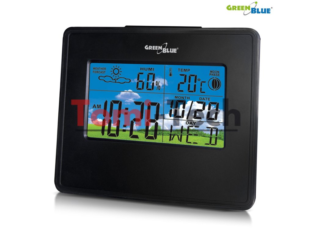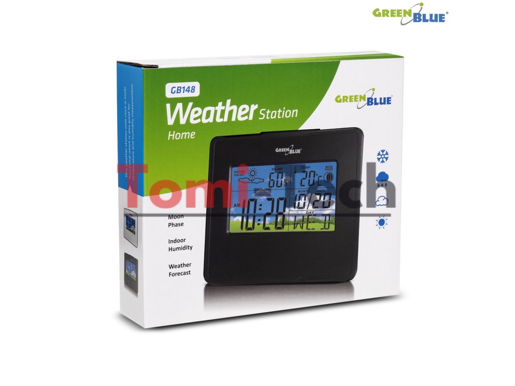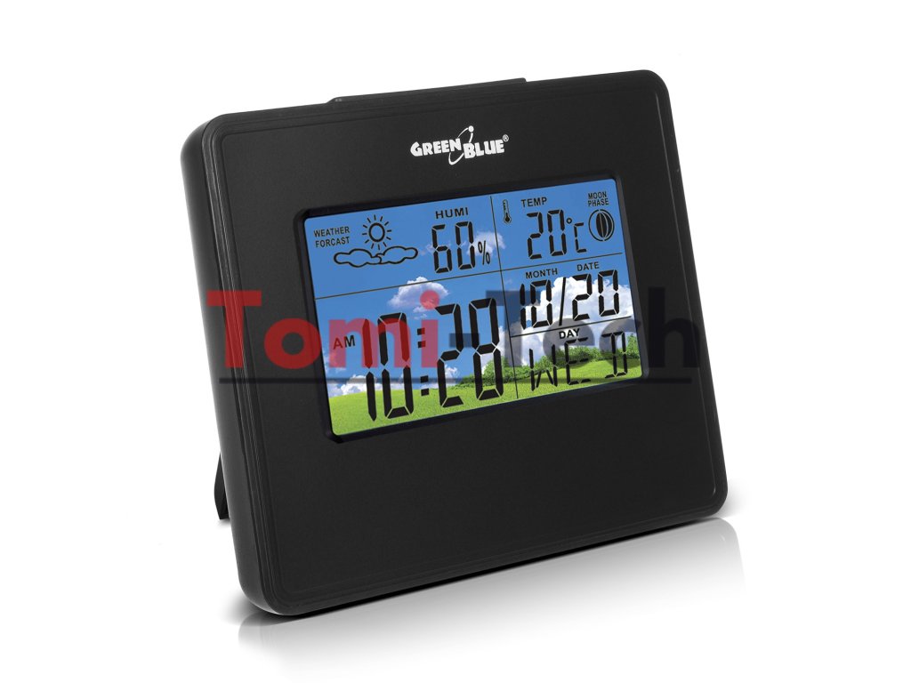 Meteorologická stanica s hodinami a kalendárom, fázami mesiaca, zeleno-modrou GB148B, čiernou