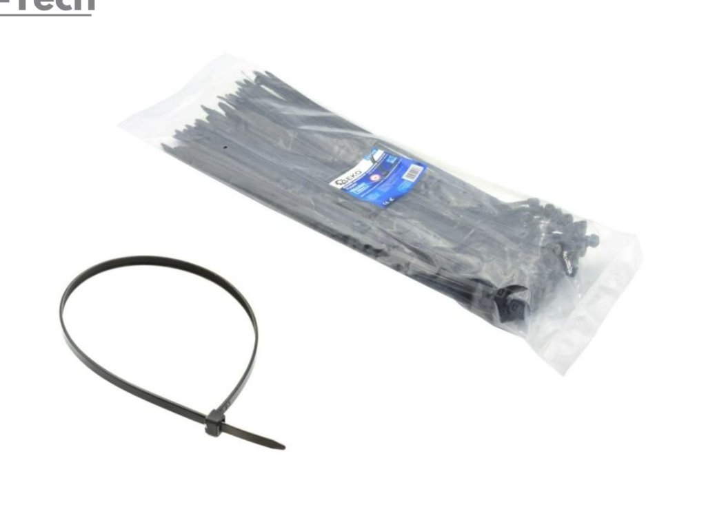 Plastové sťahovacie pásky z polyamidu sú dlhé 200mm a široké 7,6mm v čiernej farbe.