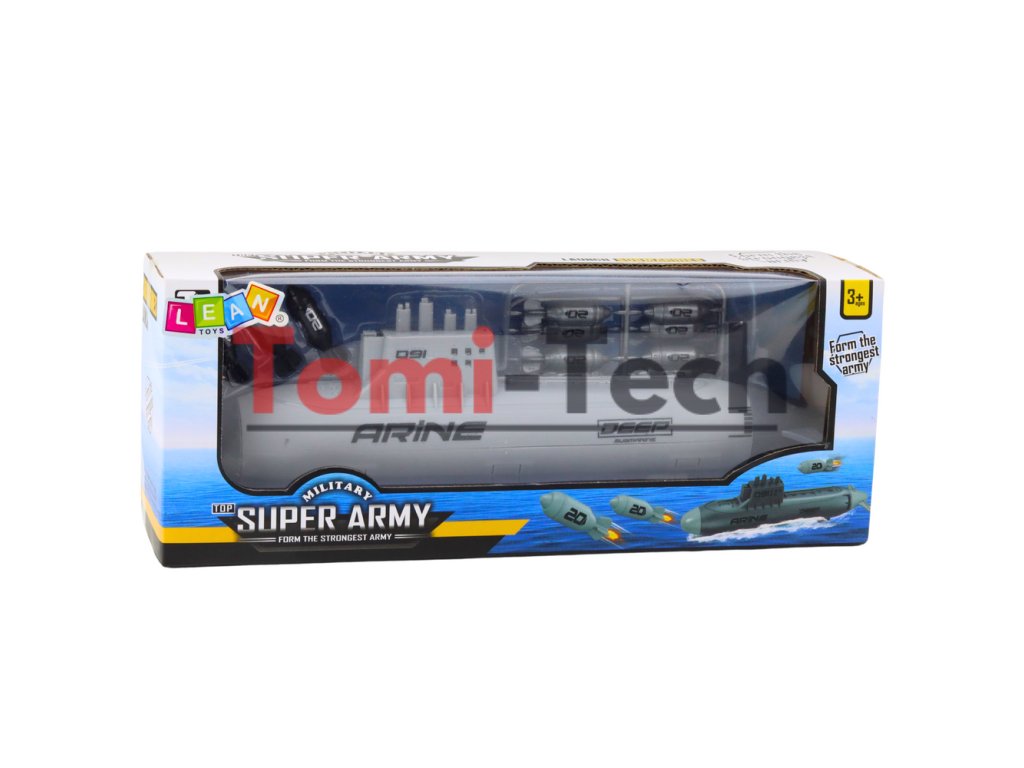 Táto realistická 28 cm dlhá ponorka je perfektnou hračkou pre malých fanúšikov vojenských a námorných dobrodružstiev. Vďaka treciemu pohonu (mechanickému napínaniu) sa loďka môže pohybovať na hladine a funkcia odpaľovania torpéd dodáva vzrušenie a robí každú hru atraktívnejšou.