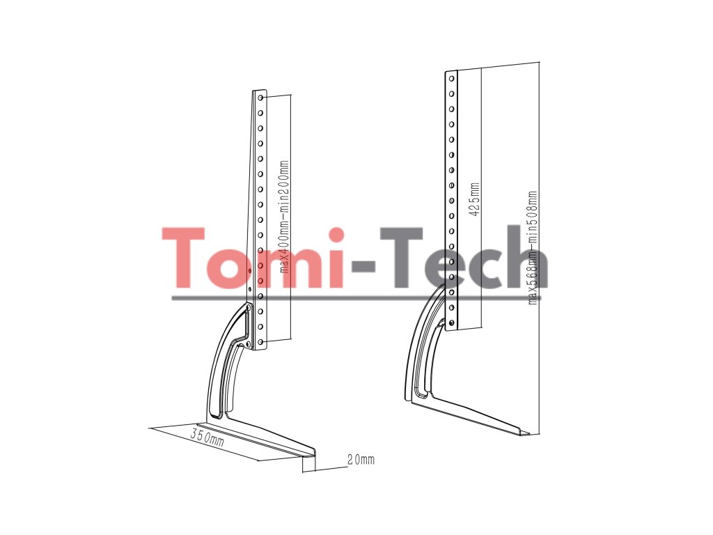 Držiak podporuje štandardy VESA s nastaviteľnou výškou od 100 mm do 400 mm a šírkou od 200 mm do 800 mm, čo zaisťuje všestrannosť a kompatibilitu s rôznymi modelmi televízorov. Sada obsahuje montážne skrutky pre rýchlu a bezproblémovú inštaláciu. Štýlová čierna povrchová úprava dodáva moderný nádych a robustná konštrukcia zaisťuje stabilitu a bezpečnosť vášho televízora.