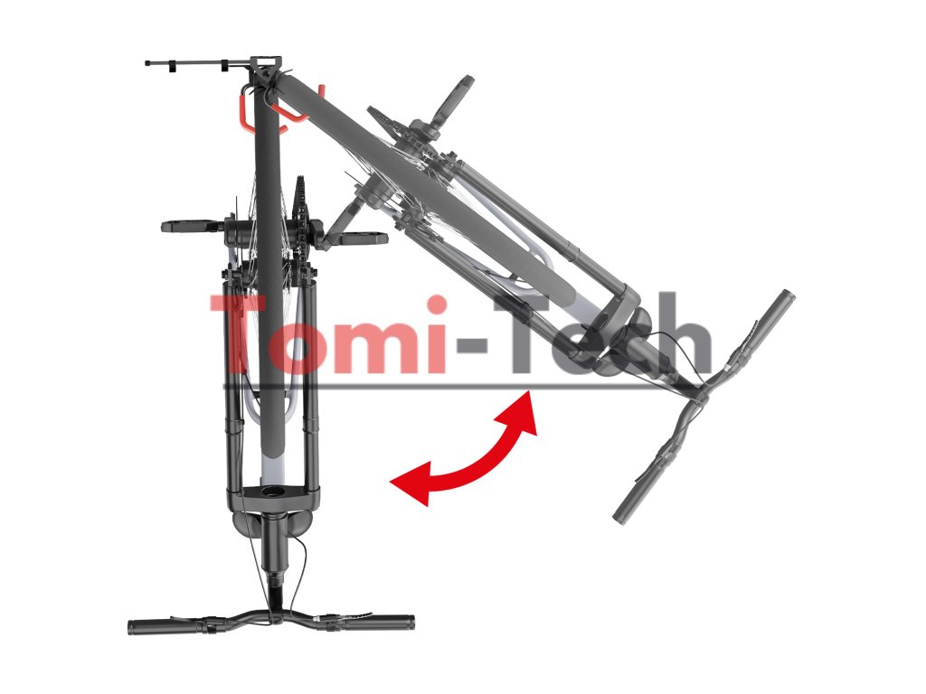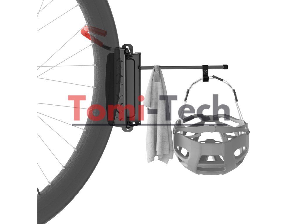 Na zavesenie bicykla jednoducho prevlečte ráfik predného kolesa cez háčik na nosiči. Tým sa bicykel s kolesom podoprie, čím sa minimalizuje riziko poškodenia rámu alebo iných častí bicykla. Nosič poskytuje stabilitu a bezpečnosť tým, že drží bicykel vo zvislej polohe. Po zavesení bicykla je možné nosič otočiť doľava alebo doprava o 65 stupňov, čo umožňuje uloženie bicykla bližšie k stene. Hák je potiahnutý gumou, ktorá chráni ráfik kolesa bicykla pred poškriabaním.