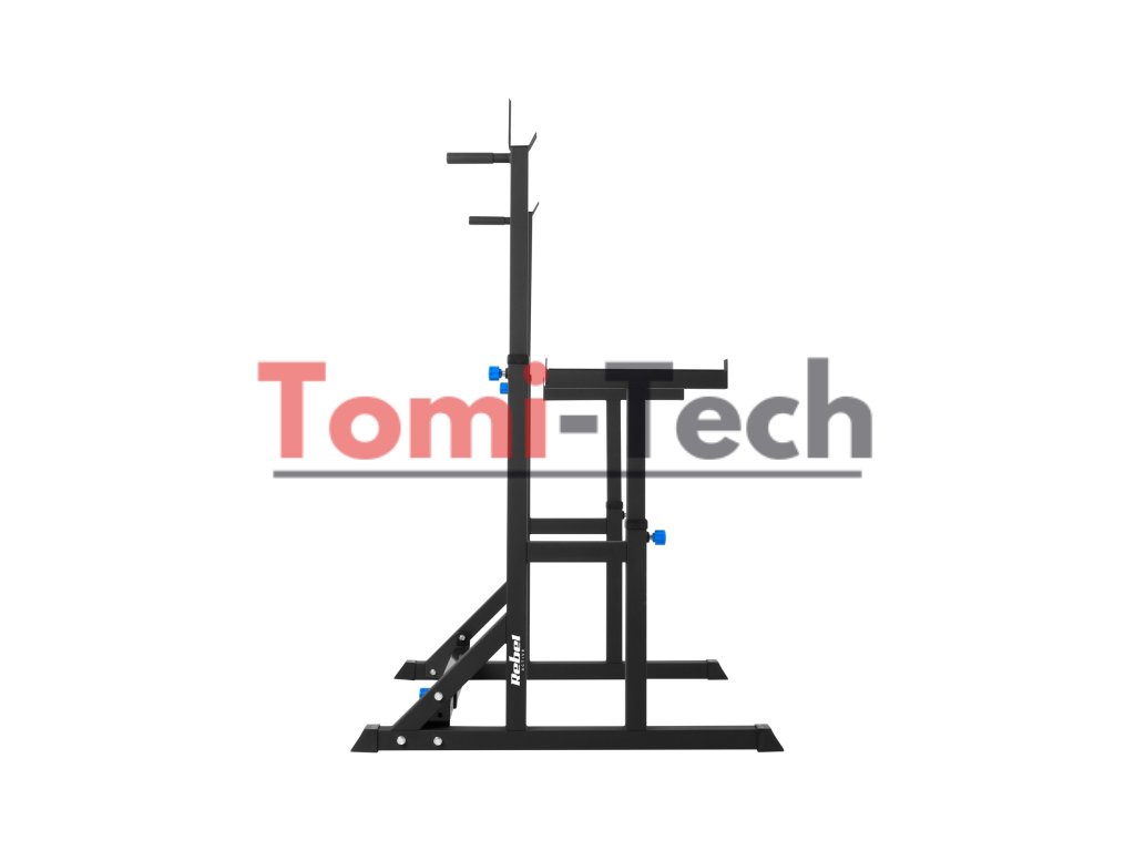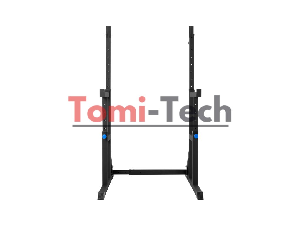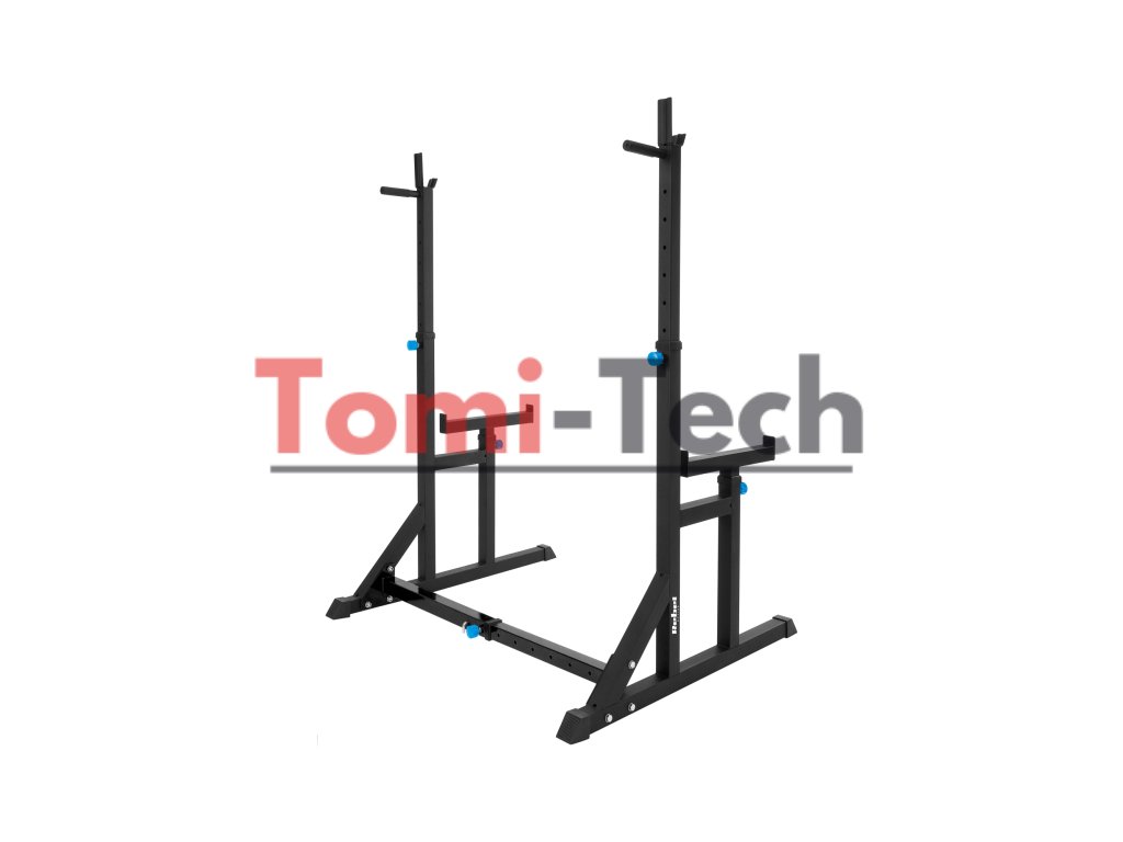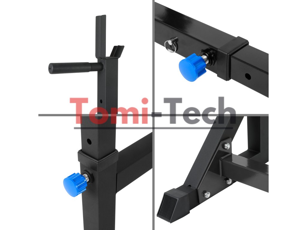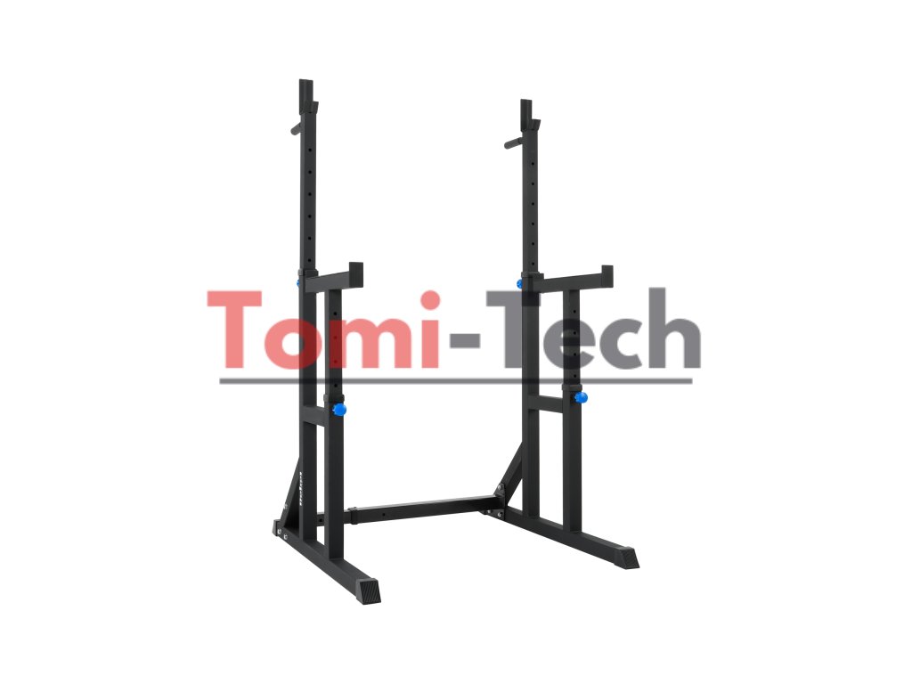 Stojany sú vyrobené z vysoko kvalitnej ocele s hrúbkou 1,5 mm, čo zaisťuje odolnosť a stabilitu počas používania. Maximálna nosnosť stojanov a strednej police je 200 kg, čo umožňuje bezpečné vykonávanie intenzívnych tréningov s ťažkými váhami.