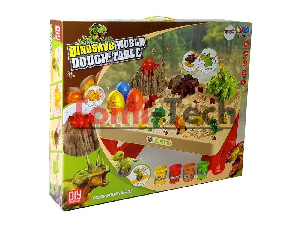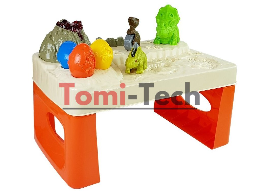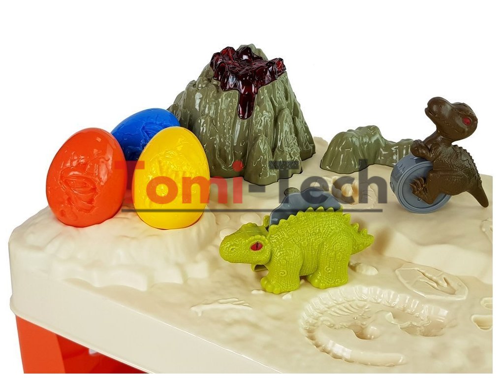 Predstavená súprava urobí veľkú radosť všetkým deťom, najmä tým, ktoré milujú prehistorické dinosaury. Na stole je sopka so žeravou lávou, ktorá spestrí zábavu. Súčasťou sady sú aj tri vajíčka, ktoré po rozpolení odhalia podobizeň malého dinosaura. Tri väčšie prehistorické plazy sa používajú na presnú prácu, ako je rezanie a razenie.