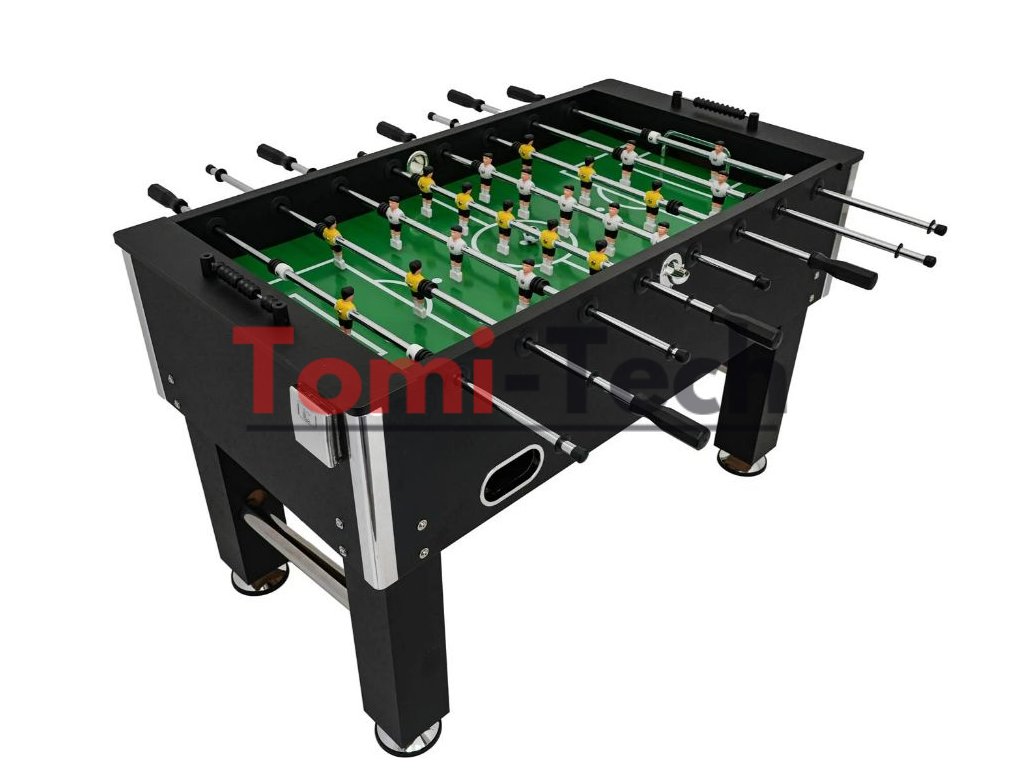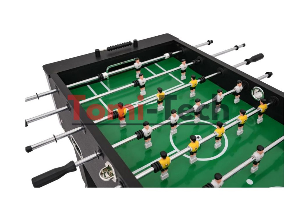Stôl na stolný futbal je vyrobený z odolnej MDF dosky pokrytej pružným laminátom, čo zaisťuje dlhú životnosť. Ergonomické rukoväte z perforovaného materiálu minimalizujú kĺzanie rúk, zatiaľ čo stabilné nohy so zosilnením zaručujú pevnosť pri hre. Hráči sú navyše rozšírení v mieste úderu loptičky, čo zvyšuje presnosť hry. Stôl je vybavený praktickými doplnkami, ako sú držiaky na nápoje, manuálne počítadlá gólov a tri hracie loptičky.