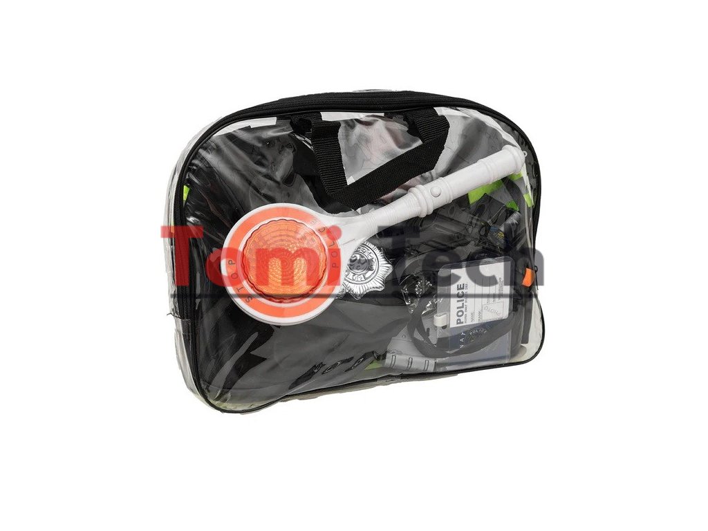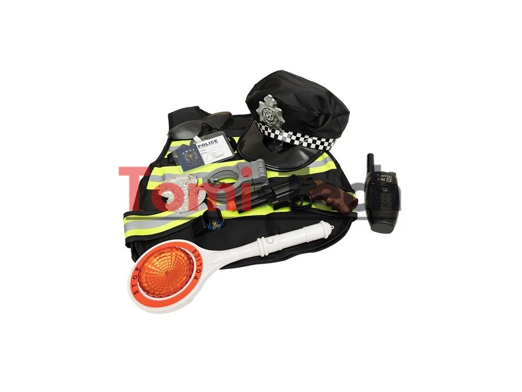 - Kompletná sada: obsahuje všetko, čo potrebujete pre úspešné prezlečenie – reflexnú vestu, čiapku, policajné lízanku, vysielačku, revolver, policajný odznak, putá s kľúčmi, identifikačný odznak, okuliare a píšťalku.