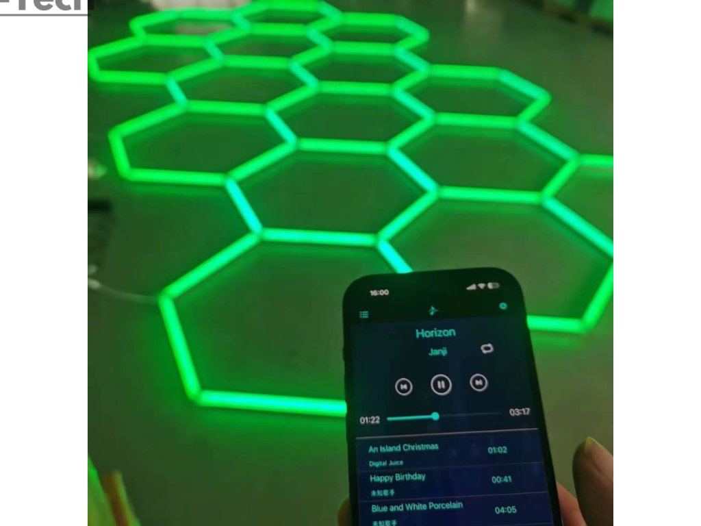 Modulárny systém umožňuje spájanie viacerých hexagonov do vlastných tvarov a vzorov. RGB osvetlenie dodáva priestoru dynamiku a jedinečný vizuálny charakter.