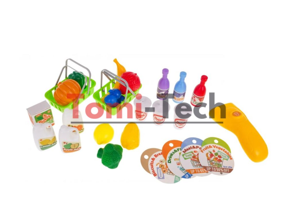 Obsah:,skener, 2 x košík, 2 x karta, 4 x čiarové kódy pre produkty,4 x bankovka, 3 x džús vo fľaši, 3 x džús vo veľkej fľaši,šťava v krabičke, 3 x pohár s nápojom,tekvica, jahoda, kukurica, banán,zelená paprika, hrozno, citrón, brokolica