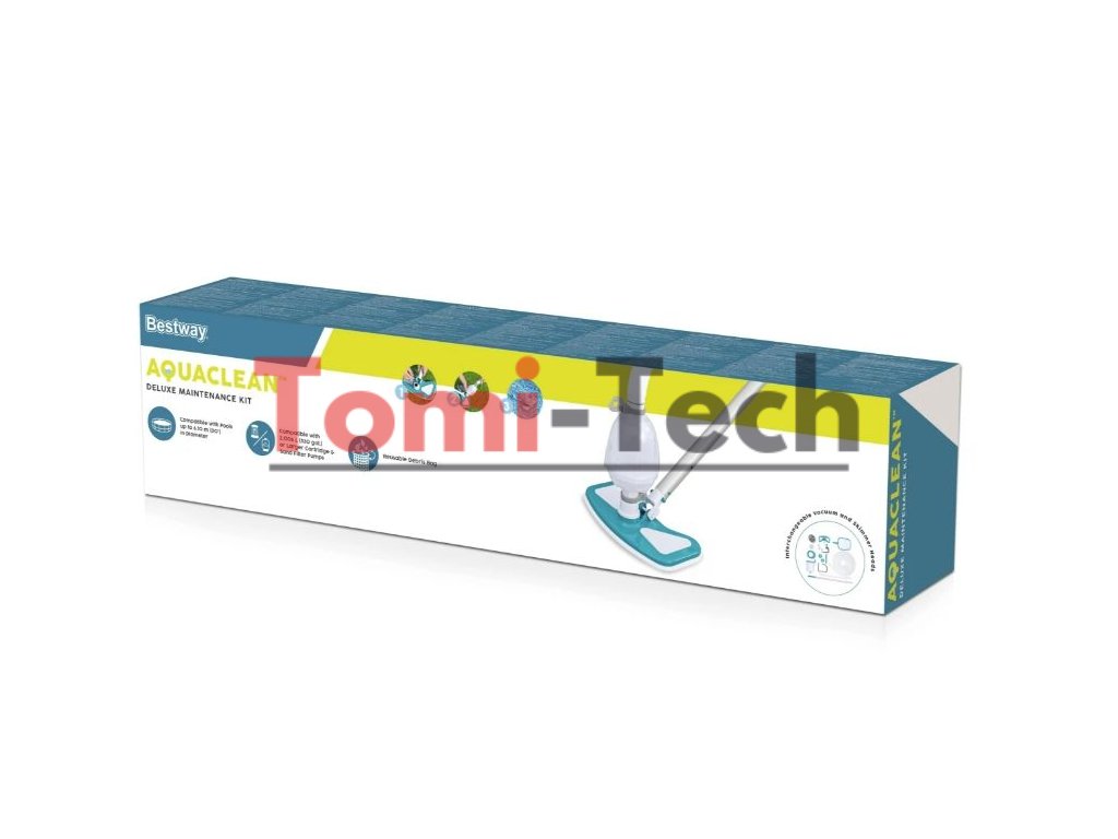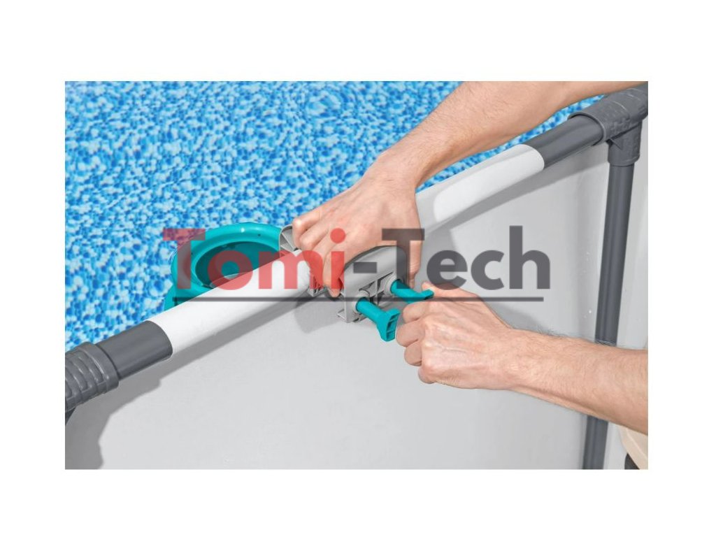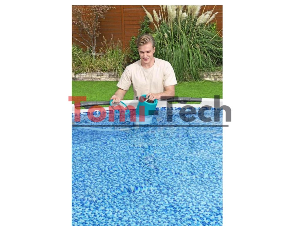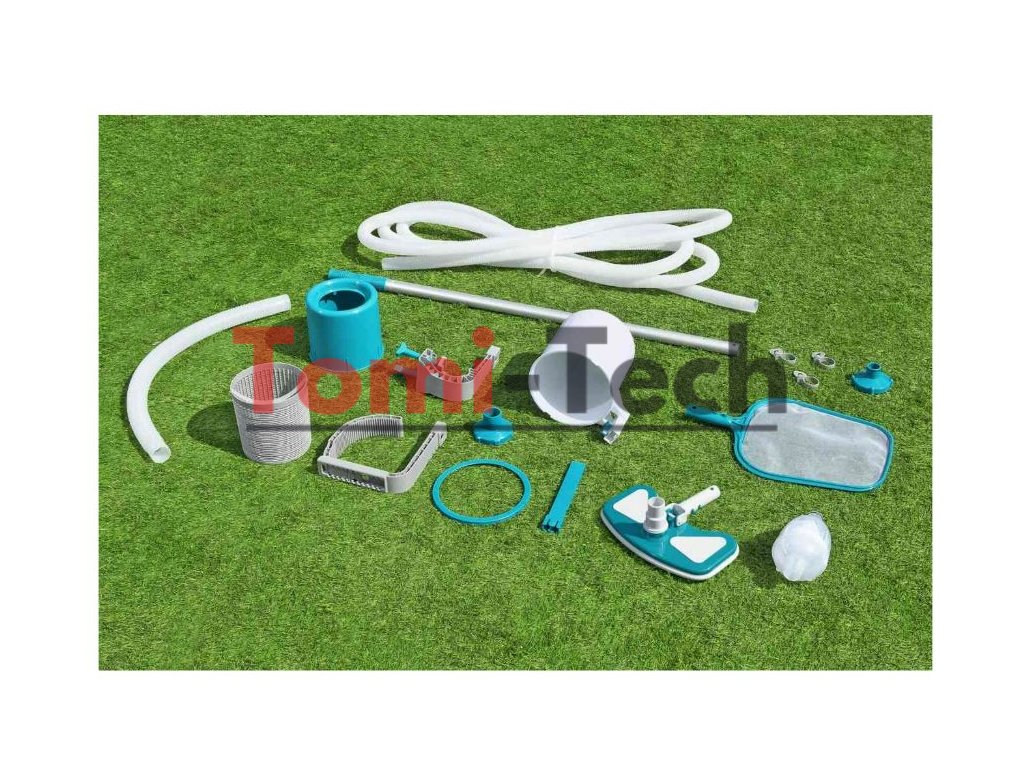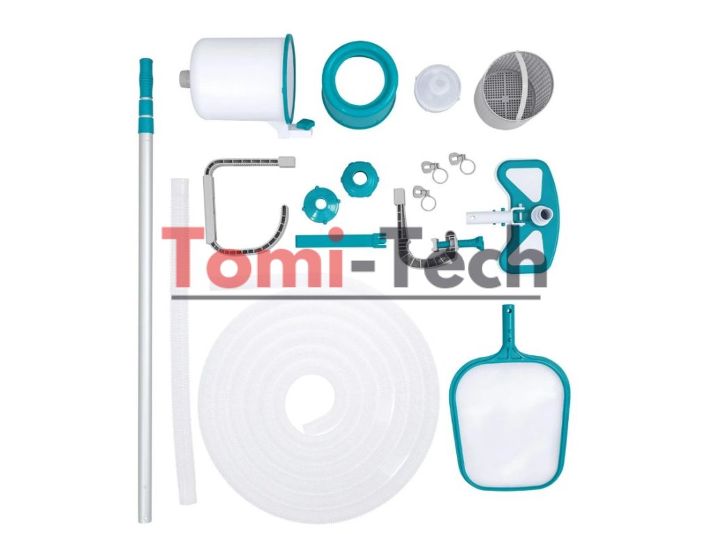 tyč s max. 2,79 m dlhé,rôzne nástavce na pripojenie filtračného čerpadla,vysávač s opakovane použiteľnou nádržou na zber bazénového odpadu,sieťka na zachytávanie bazénového odpadu,7,5 m dlhá, 3,2 m široká záhradná hadica.