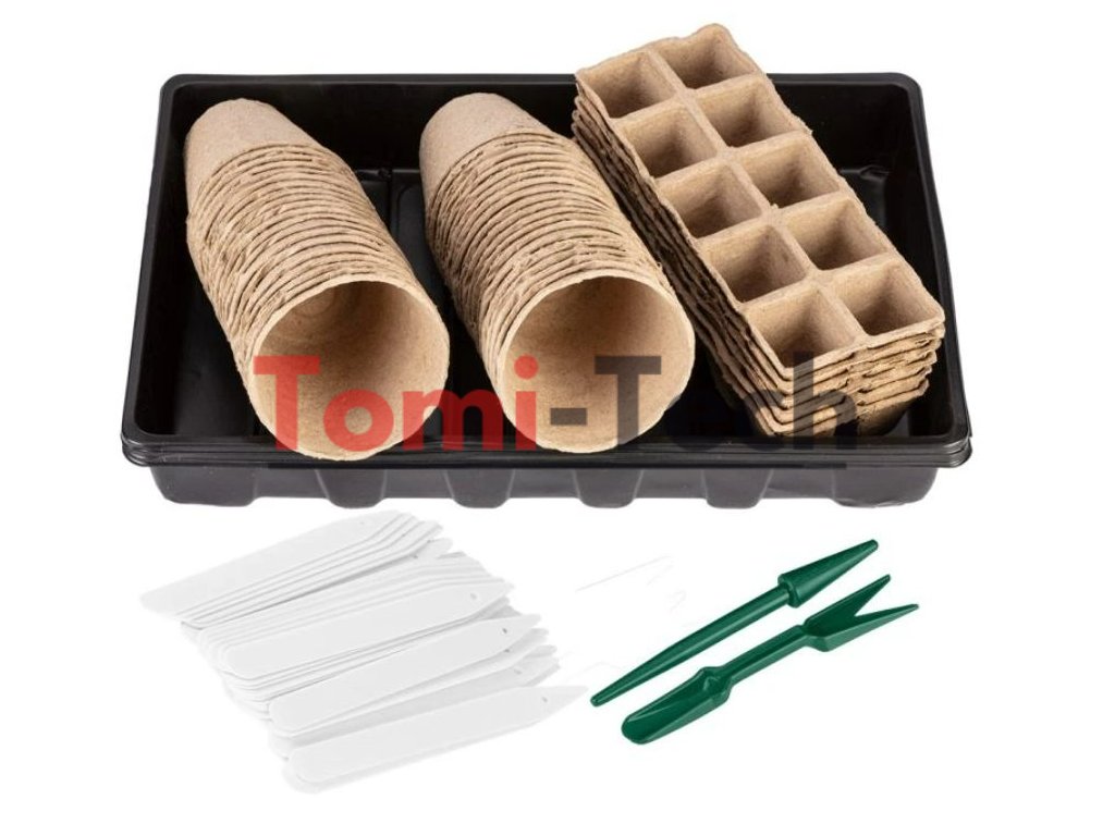 Sada sadeníc 88 položiek 15G467 VERTO sada obsahuje: 3 plastové misky (37,5x23,5x8,65 cm); biologicky rozložiteľné rašelinové semenáčiky: 4 kusy pre 10 rastlín (2x5 otvorov); 39 okrúhlych kusov (fi 8 cm); 40 bielych tanierov/štítkov, vyrobených z plastu; 1 malý pikírovač (plast); 1 obojstranná špachtľa (plast).