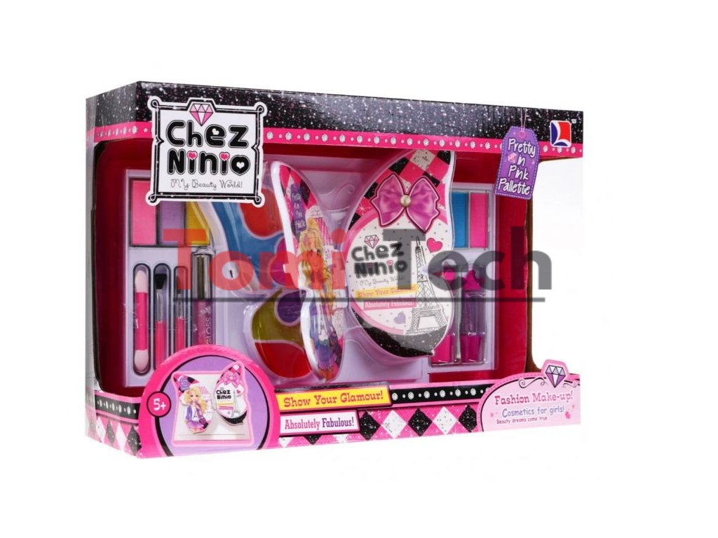Fantastická sada make-up s rozkladacou krabičkou. Obsahuje všetko potrebné na líčenie - celú sadu farebných očných tieňov, leskov na pery a rúžov.Produkt je vyrobený z certifikovaných a bezpečných materiálov. Hračka je určená deťom od 3 rokov.