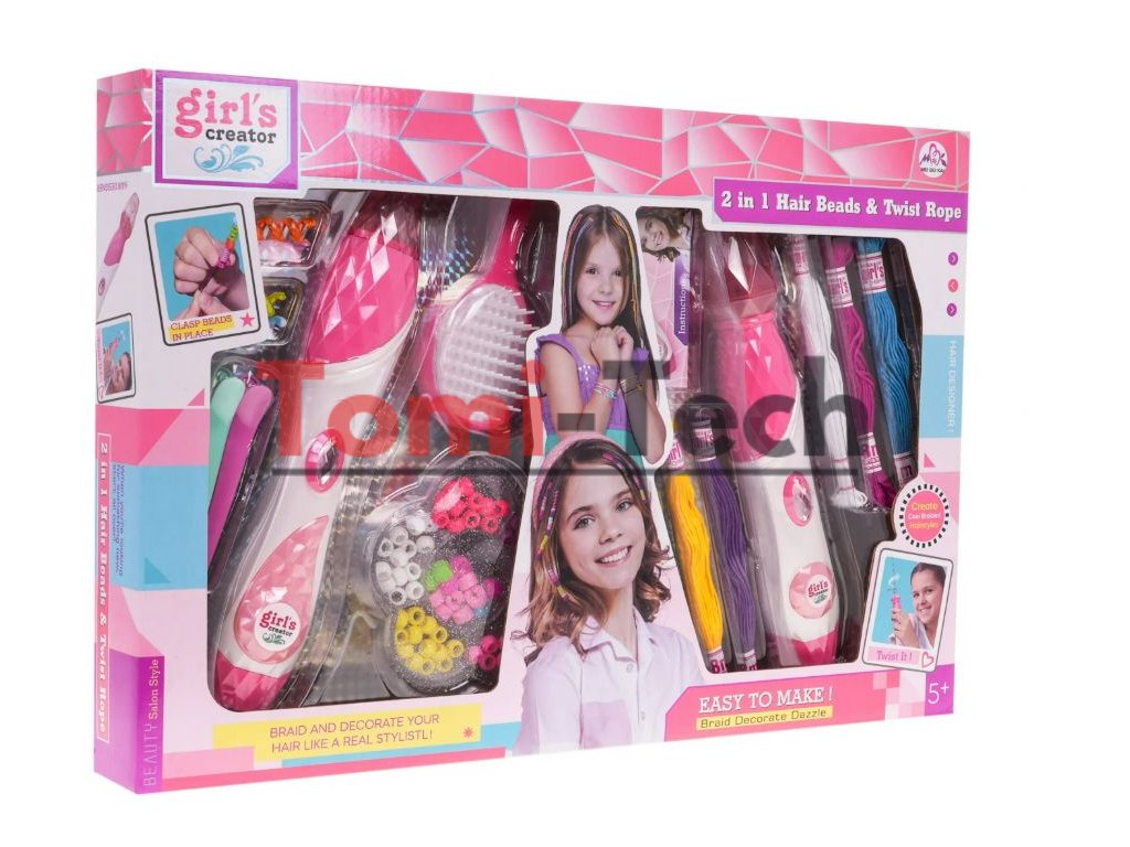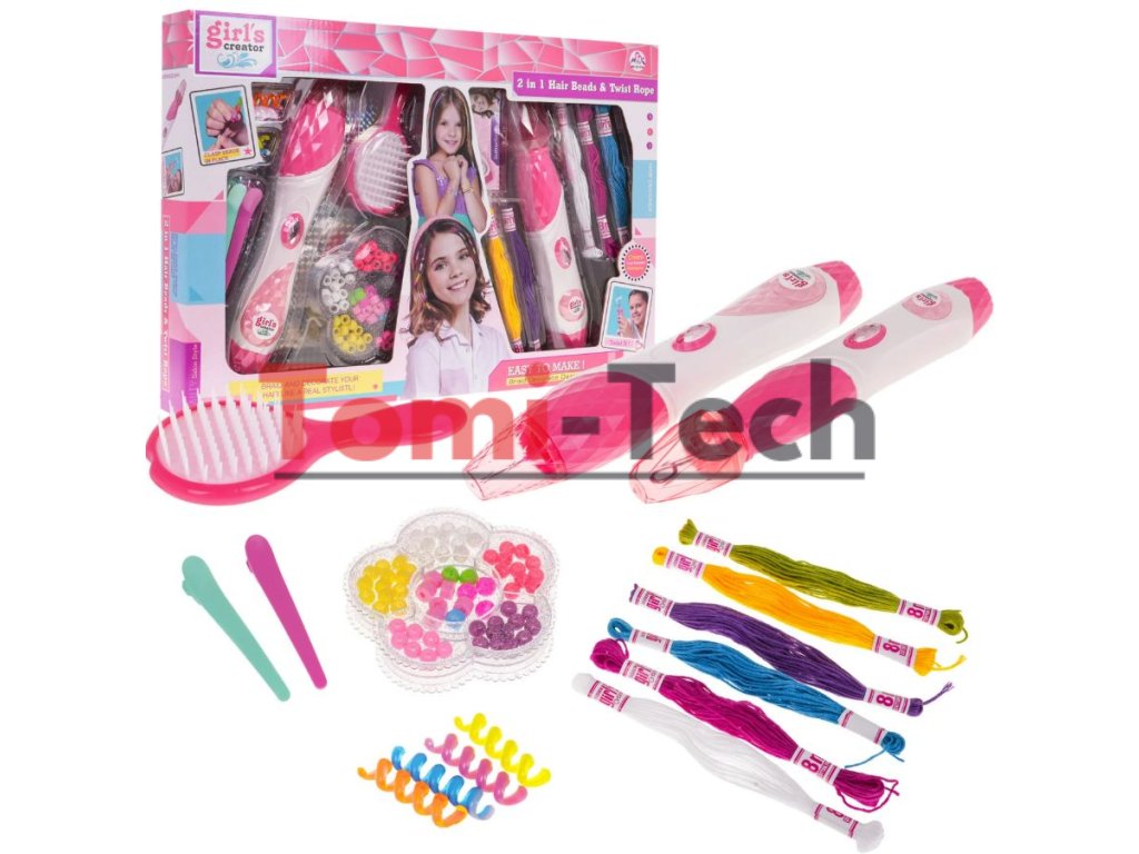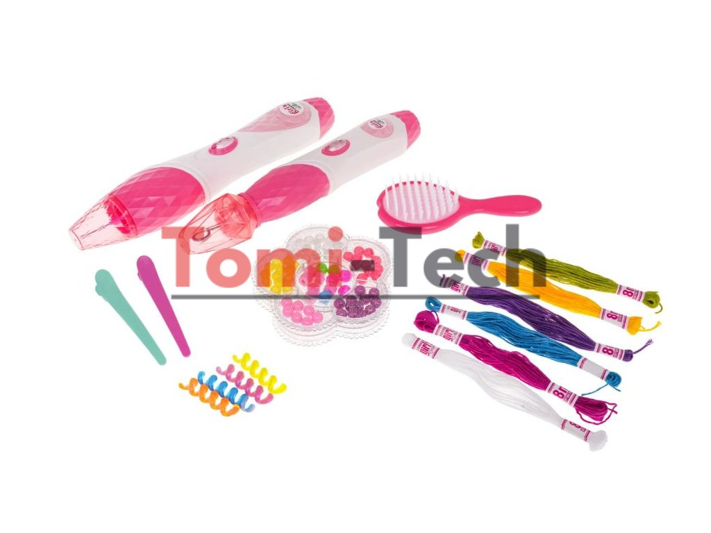 Vlasová súprava s dvomi vlasovými prístrojmi, kefkou na vlasy, korálkami, niťou a sponkami. Strojček na pletenie nite je napájaný 2 x AA 1,5 V batériami, batérie nie sú súčasťou balenia.