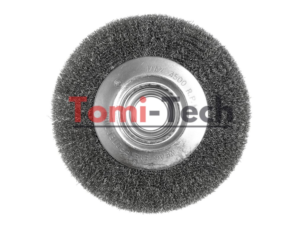Drôtená kotúčová kefa 200 x 32 mm, vlnitý oceľový drôt, max. otáčky: 4500 ot./min, EN 1083-2, redukcie súčasťou balenia: 2 x 12,7 mm (1/2"), 2 x 16 mm (5/8"), 2 x 19 mm (3/4"), 2 x 22,2 mm (7/8"), 2 x 25,3 mm (1")Dodatočné parametre