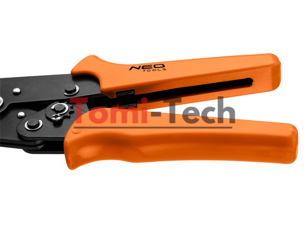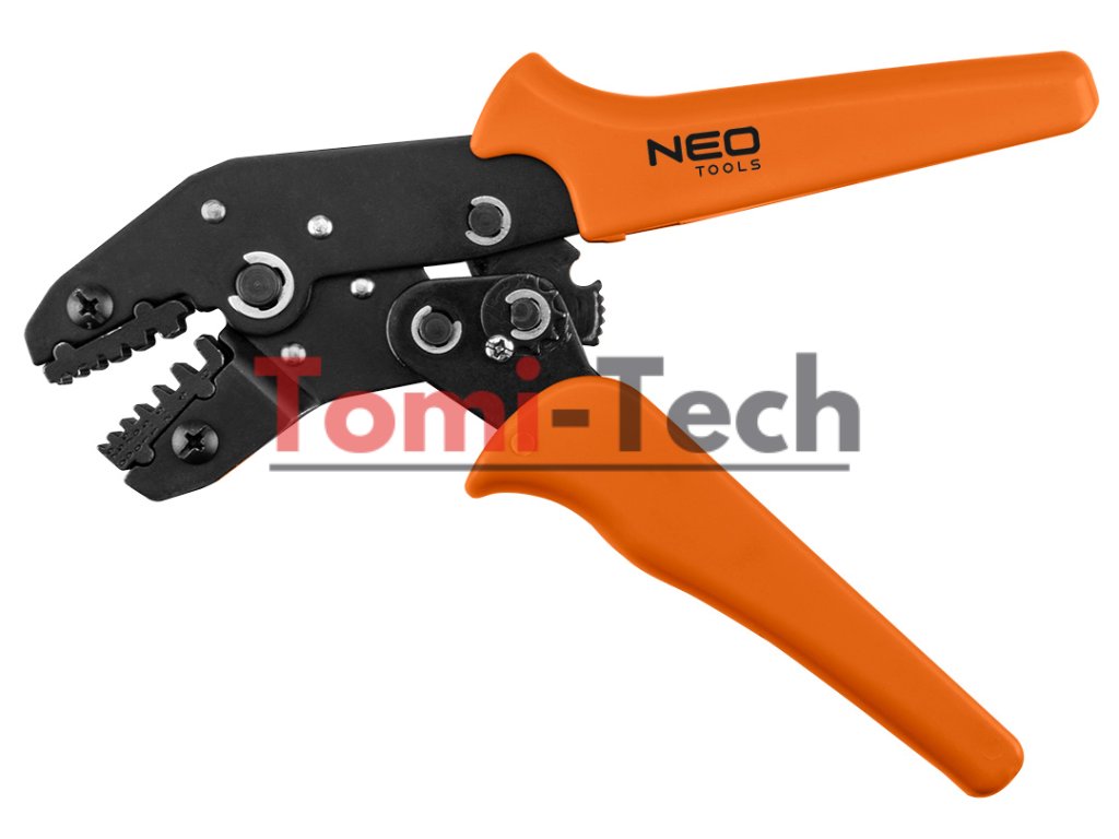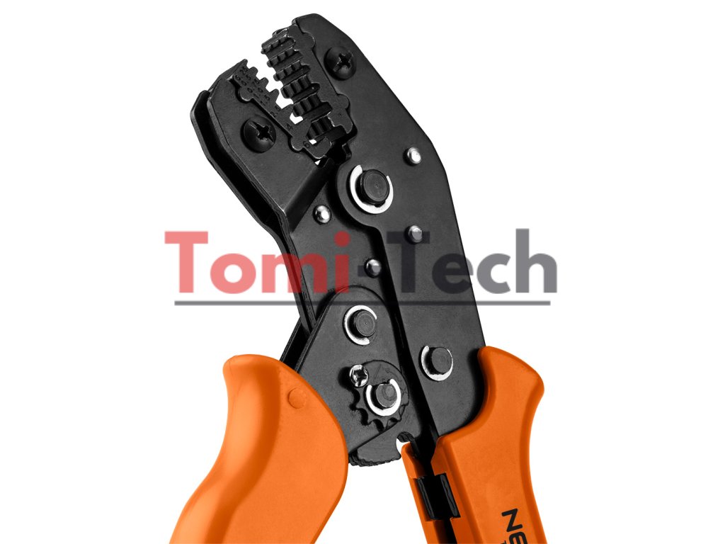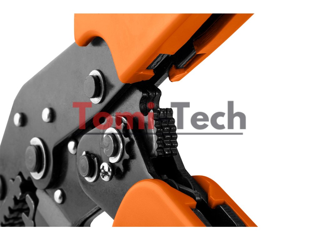 Krimpovacie kliešte, dĺžka 195 mm, rozsah 0,25-6,0 mm, materiál uhlíková oceľ, tvrdosť 45 HRC, čierny povrch, jednozložková rukoväť, pre objímkové konektory, račňový systémDodatočné parametre