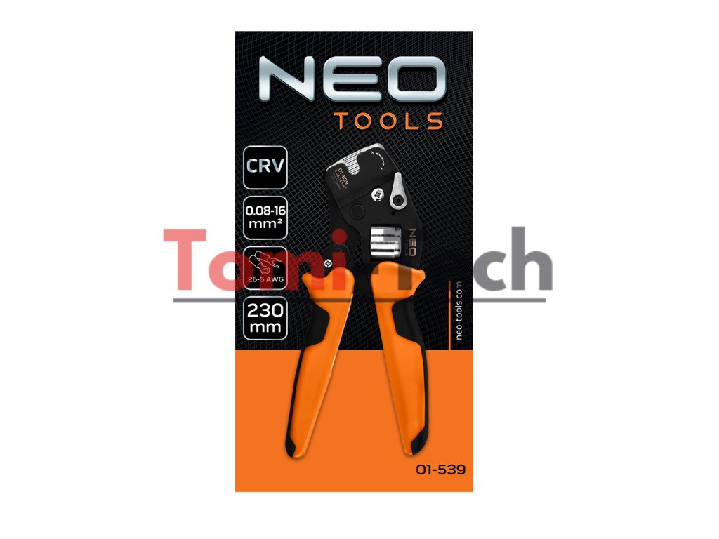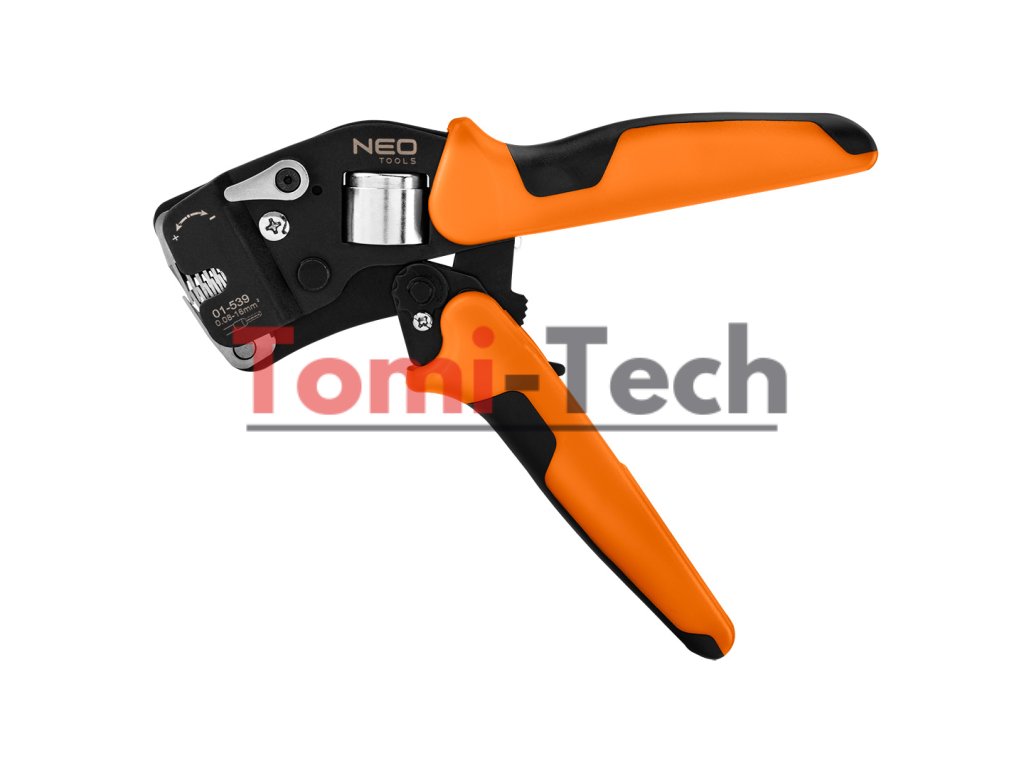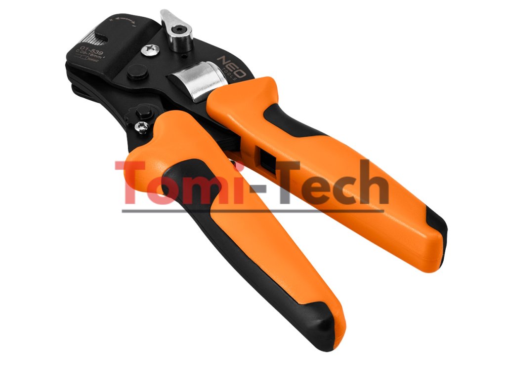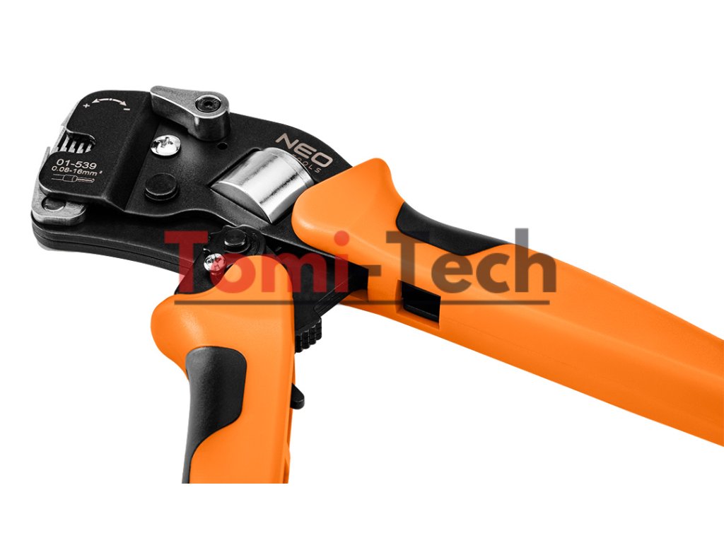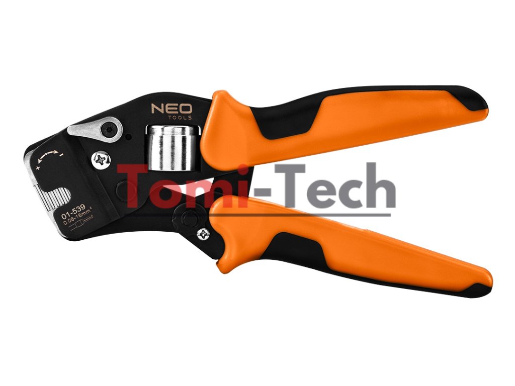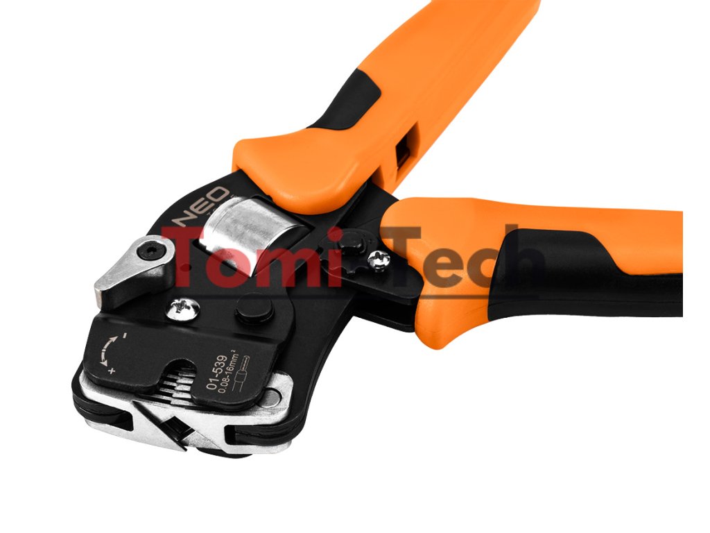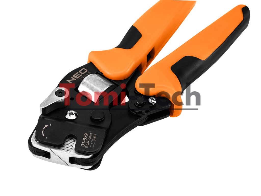 Krimpovacie kliešte na koncové dutinky, oceľ CRV, dĺžka 230 mm, samonastavovacie 0,08 - 16 mm2, AWG 26 - 5, dvojzložková rukoväť TPR + ABS, hmotnosť 0,5 kg, manuálne nastavenie veľkosti, čelné zavádzanie vodičov, štvorcové krimpovanie, nastavenie krimpovacieho tlaku, ergonomická rukoväť, na konektory koncových dutiniek, páčka pre malé veľkosti pre konektory v rozsahu 0,08 - 10 mm2, páčka pre veľké veľkosti pre konektory v rozsahu 10 - 16 mm2Dodatočné parametre