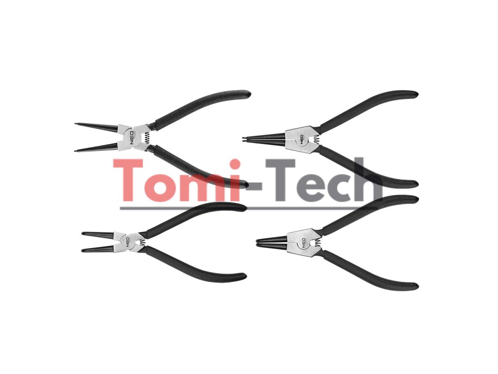 Kliešte na poistné krúžky, sada 4 kusov, chróm-vanádiová oceľ, jednozložková rukoväť, vonkajšia rovná dĺžka 180 mm, vonkajšia ohnutá dĺžka 170 mm, vnútorná rovná dĺžka 180 mm, vnútorná ohnutá dĺžka 170 mm.Dodatočné parametre