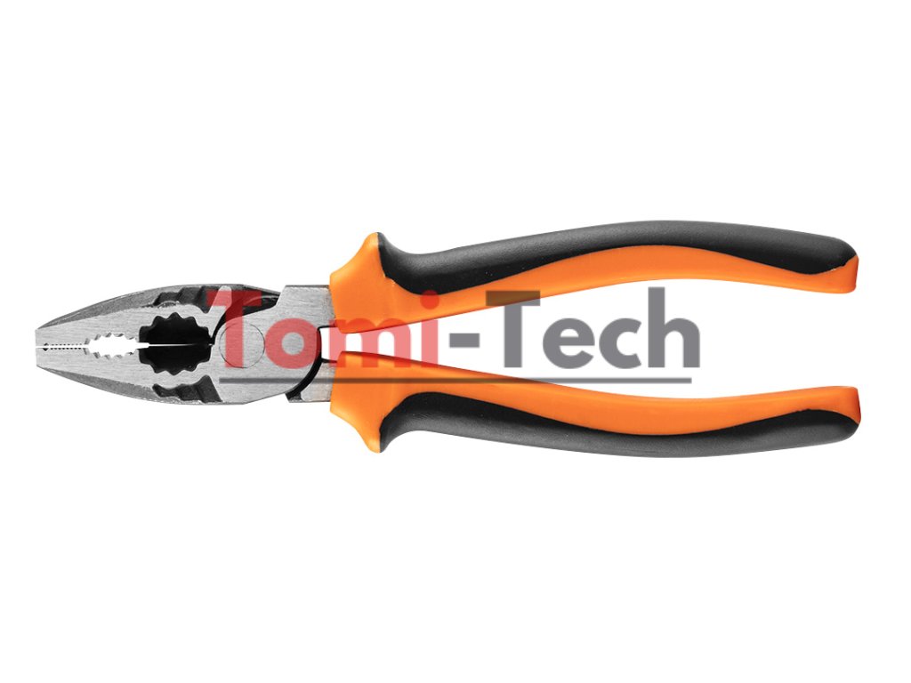 Kombinované kliešte, dĺžka 180 mm, 40 % úspora sily vďaka drieku posunutému bližšie k čeľustiam, antikorózna chrómniklová oceľ, dvojzložková rukoväť TPR+ABS, zúbkovaná hlava, dodatočný otvor v čeľustiach na uchytenie napr. klinca.Dodatočné parametre