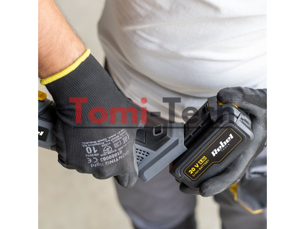 Pre zaistenie maximálneho pohodlia a slobody práce bol napájací kábel uhlovej brúsky Rebel Tool nahradený možnosťou upevnenia na batériu. K zariadeniu si môžete zakúpiť 4 Ah batériu (model RB-2002) od spoločnosti Rebel Tools, ktorá bude užitočná aj na prevádzku iného elektrického náradia z tejto série.