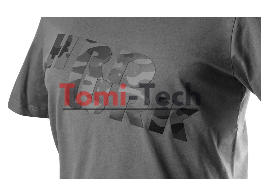 Pracovné tričko CAMO URBAN, sivé s potlačou, 100 % bavlna, 180 g/m2, potlač „HRD WRK“ s maskáčovým vzorom, certifikácia CE, veľkosť LDodatočné parametre