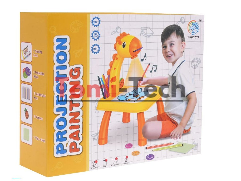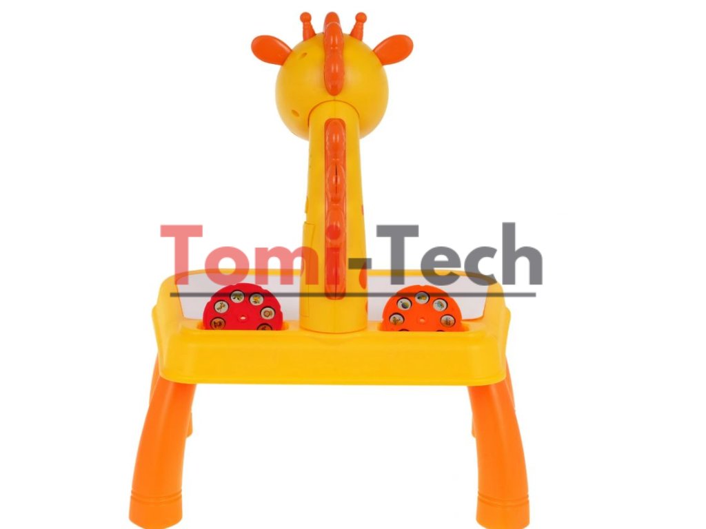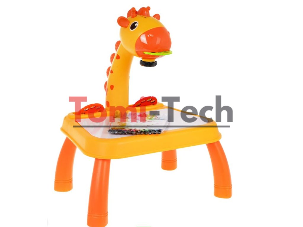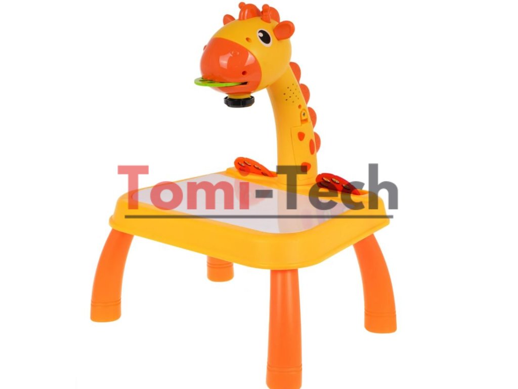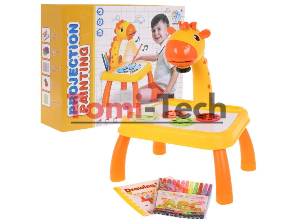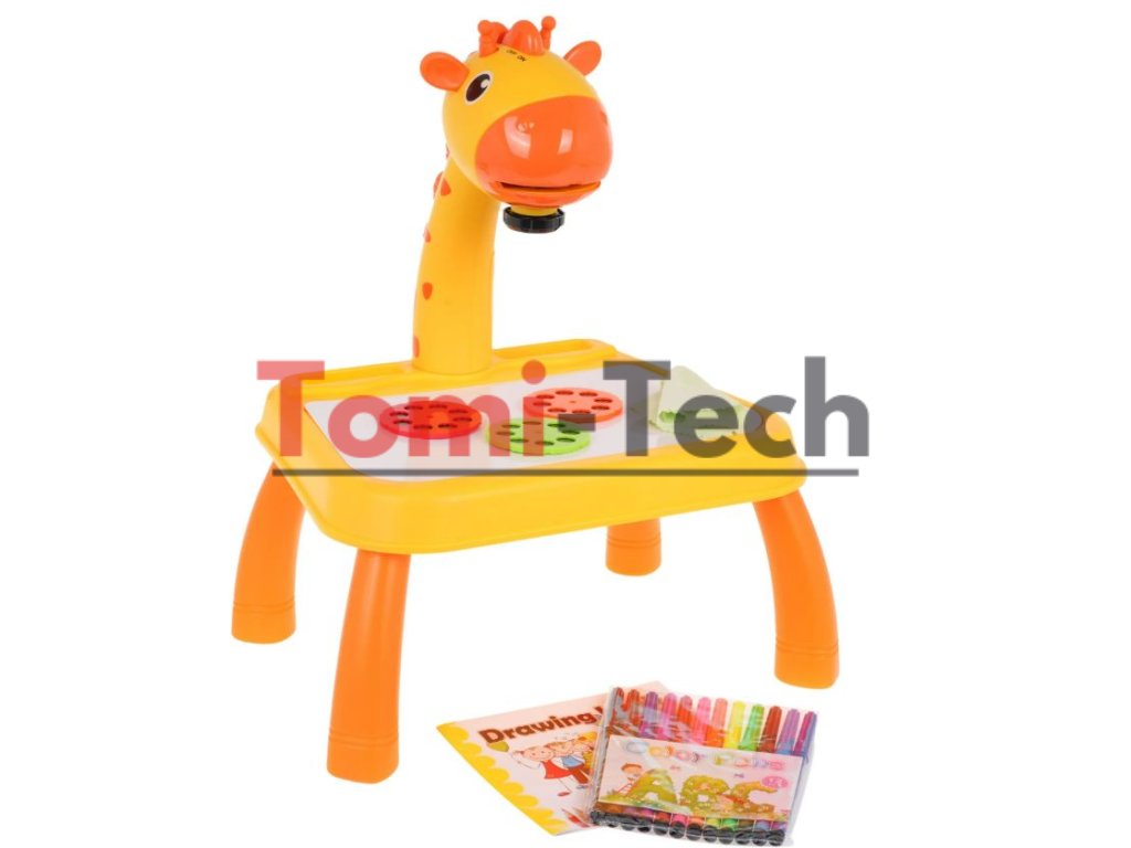 Interaktívny projektor so zvukovými a svetelnými efektmi pre deti od troch rokov. Sada obsahuje 24 diapozitívov na troch diskoch s obrázkami zvierat, vozidiel, ovocia a zeleniny. Hračka sa veľmi ľahko používa; stačí zapnúť vypínač na hlave žirafy a vložiť disk s obrázkami a objavia sa farebné diapozitívy. Diapozitívy je možné obkresľovať do zošita pomocou priložených fixiek. Vedľa vypínača sa nachádza vypínač svetla a melódie. Jedným stlačením vypínača sa svetlo rozsvieti a druhým stlačením sa prehrá jedna z melódií. Projektor na kreslenie má pohyblivú hlavu (hore a dole) a zaostrenie obrazu sa nastavuje pod hlavou. Projektor sa dá použiť aj ako stolové alebo nočné svetlo. Základňa projektora má priehlbiny na uloženie projekčných diskov. Hra s projektorom rozvíja manuálne a umelecké zručnosti a rozvíja fantáziu. Hračka je napájaná 3 x 1,5 V AA batériami, ktoré nie sú súčasťou balenia.
