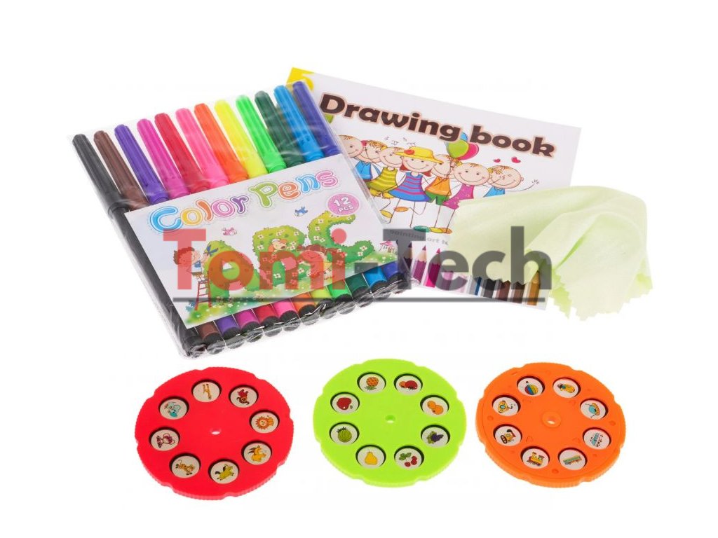 Obsah :projektor,3 disky s 8 obrázkami, ktoré spolu poskytujú 24 rôznych vzorov na maľovanie,12 fixiek,zápisník na maľovanie,handrička na odstraňovanie obrázkov z tabule.
