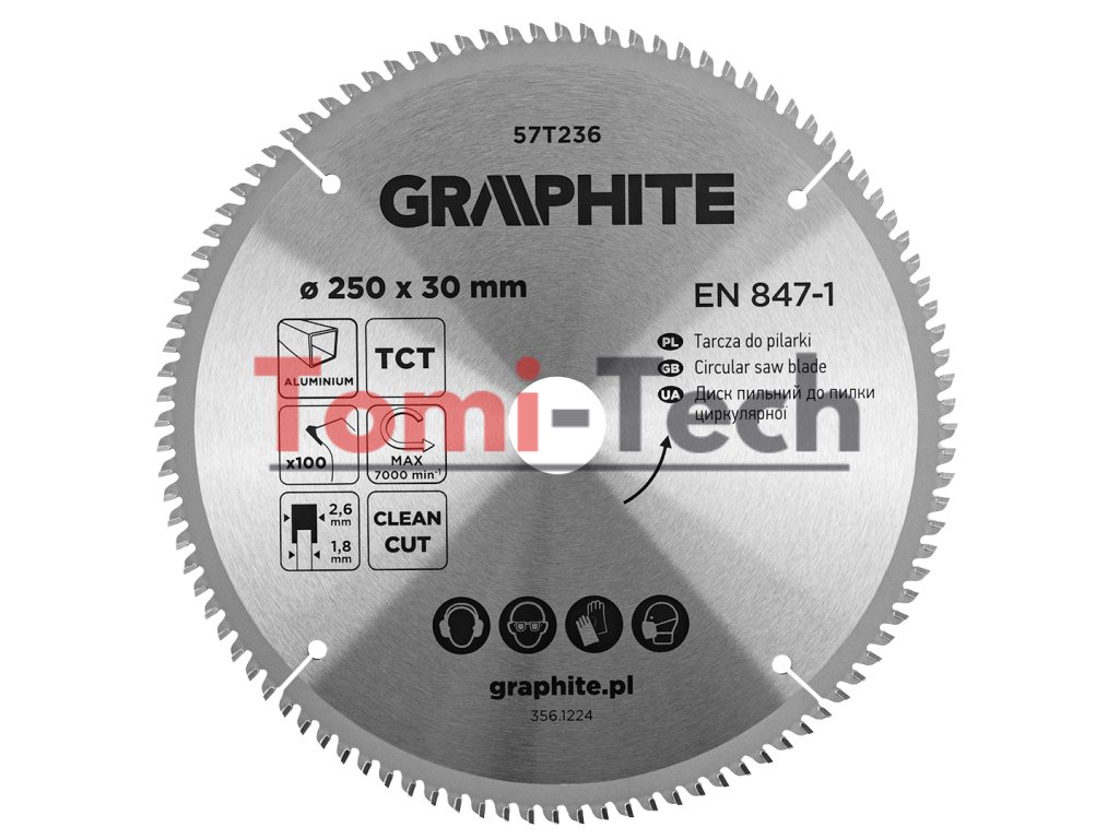 Pílový kotúč s karbidovým hrotom, vonkajší priemer: 250 mm, priemer upevňovacieho otvoru: 30 mm, počet zubov: 100, šírka rezu: 2,6 mm, maximálne otáčky: 7000 ot./min, typ rezu: Čistý rez, zhoda s normou: EN 847-1, redukcie zahrnuté v cene: 30/25,4 mm, 30/20 mm, 30/16 mmDodatočné parametre