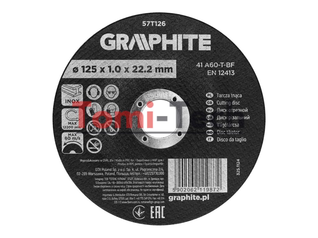 Rezný kotúč, korund na kov/INOX 125 x 1,0 x 22,2 mm, 41 A60-T-BF, 110 kusov, kartón, plochý kotúč, priemer: 125 mm, priemer montážneho otvoru: 22,2 mm, hrúbka: 1,0 mm, max. rýchlosť otáčania: 12200 ot./min, 80 m/s, norma: EN 12413, použitie: na rezanie kovu/INOXDodatočné parametre