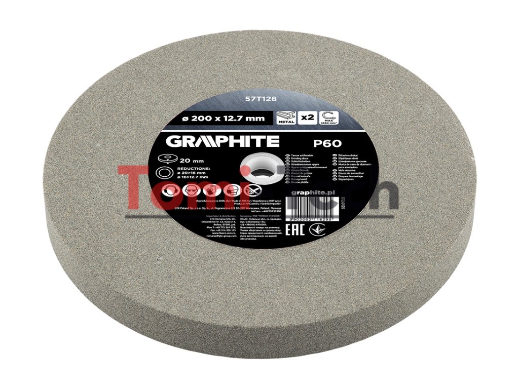 Brúsne kotúče 200 x 20/16/12,7 x 16 mm, zrnitosť P60, 2 ks v sade, vonkajší priemer 200 mm, vnútorný priemer montážneho otvoru 12,7 mm, redukcie súčasťou balenia 20 > 16 a 16 > 12,7 mm, hrúbka: 20 mm, maximálne otáčky 3350 ot./min, použitie: kovDodatočné parametre