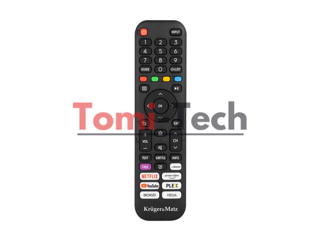 Diaľkové ovládanie dodávané s televízorom Kruger&Matz je navrhnuté pre pohodlné a intuitívne používanie. Diaľkové ovládanie obsahuje skratky k najpopulárnejším aplikáciám, ako sú Netflix, YouTube a Amazon Prime Video. Vďaka nim môžete rýchlo spustiť svoj obľúbený obsah bez toho, aby ste museli prechádzať ponuky alebo vyhľadávať aplikácie.
