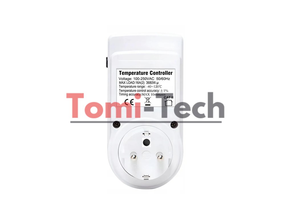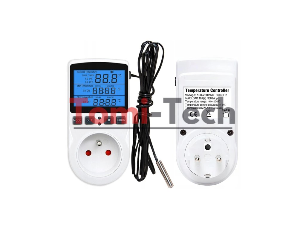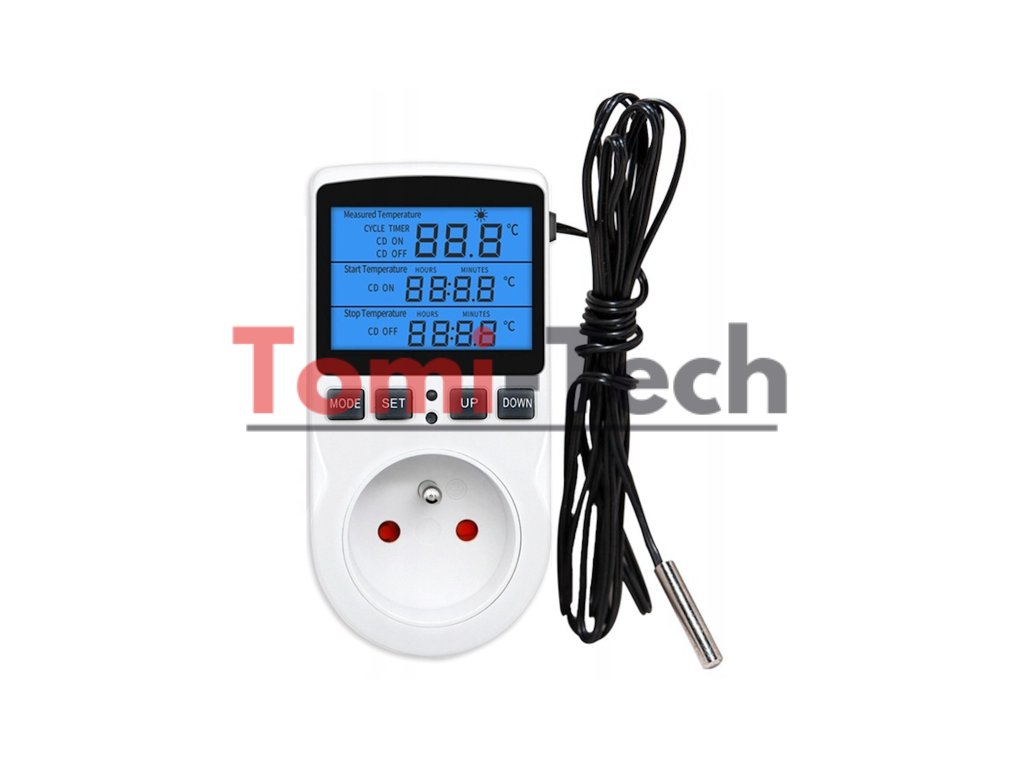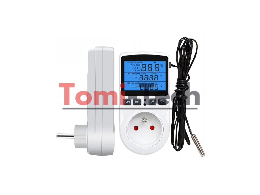 Termostat 230V + sonda? Multifunkčný termostat - digitálny regulátor teploty, zásuvka s časovým spínačom, senzorová sonda na vykurovanie/chladenie 16A 230V/110V. Termostat je malý a zapojuje sa do zásuvky, čo umožňuje automatické ovládanie chladenia a vykurovania. Má prehľadný LED displej a vodotesný teplotný senzor so 150 cm káblom. Zariadenie je možné použiť v chladničkách, peciach, čerpadlách, bazénoch, udiarňach, kdekoľvek je potrebná regulácia teploty. Funkcie merača: Externý teplotný senzor dokáže detekovať teplotu. Nastavenie zapínacích a vypínacích teplôt. Čas cyklu, časy spustenia a zastavenia, časový spínač. Široko používaný v inteligentných riadiacich aplikáciách, ako je vykurovanie uhlím, skleníky atď. Technické údaje: Napätie 110V ~ 230V AC 50Hz/60Hz Maximálne zaťaženie 16A(2) 3680W.u Teplotný rozsah -40 ~ 120 °C Presnosť +/- 1% Presnosť časovania max. 10 minút Teplotný rozsah -40 ~ 120 °C Prerušený obvod (alebo menej ako -40 °C), v prvom riadku obrazovky bliká „1“, -40 ~ -45 °C, zobrazenie -40 °C Skrat (alebo viac ako 120 °C), v prvom riadku obrazovky bliká zobrazenie ''E2'', zobrazenie 121-129 °C 120 °C Nižšie ako -10 °C alebo vyššie ako 100 °C, hodnota za desatinnou čiarkou sa nezobrazí Režim chladenia, počiatočná teplota > teplota vypínania Režim vykurovania, počiatočná teplota < teplota vypínaniaDodatočné parametre