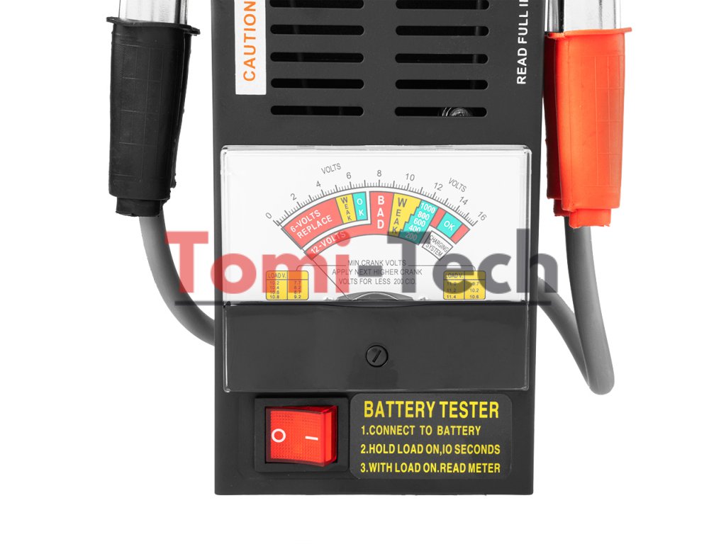Tester batérií 100 A / 12 V, 50 A / 6 V, presnosť merania +/- 0,2 V, test - 10 sekúnd / 1 minúta na vychladnutie, max. 3 testy počas 5 minút.Dodatočné parametre