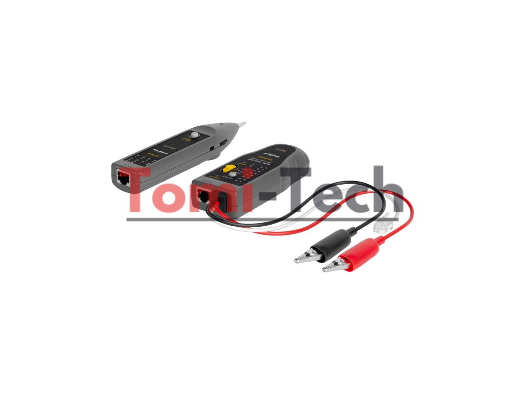 Tester je vybavený dvoma krokosvorkami a konektorom RJ11, čo umožňuje jednoduché pripojenie k rôznym typom vodičov. Vstavaný reproduktor a pracovné svetlo prijímača zvyšujú pohodlie pri práci, najmä v slabo osvetlených priestoroch. Indikátor slabej batérie navyše zaručuje, že vás nikdy neprekvapí náhle vybitie batérie.