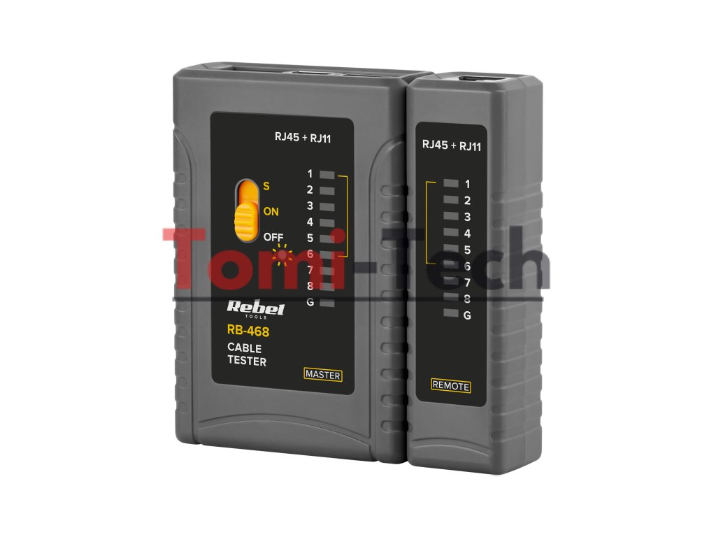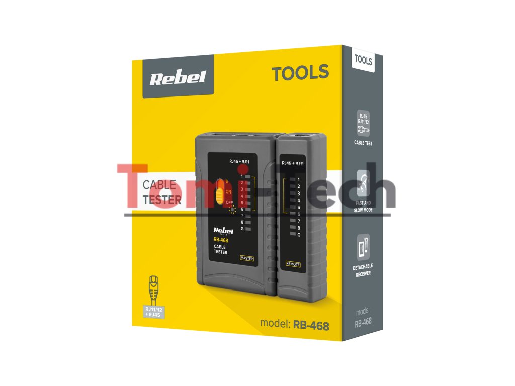 REBEL RB-468 umožňuje testovať rôzne káble typy vrátane RJ11, RJ12 a RJ45, vďaka čomu je všestranným nástrojom na kontrolu telefónnych liniek aj sieťovej kabeláže. Tester používa LED diódy na indikáciu stavu kábla, čo umožňuje rýchlu a jednoduchú identifikáciu problémov. Zariadenie dokáže detekovať skraty, prerušené obvody, zemné poruchy a obrátené zapojenie, čo je kľúčové pre zabezpečenie správnej prevádzky telekomunikačných a sieťových systémov.