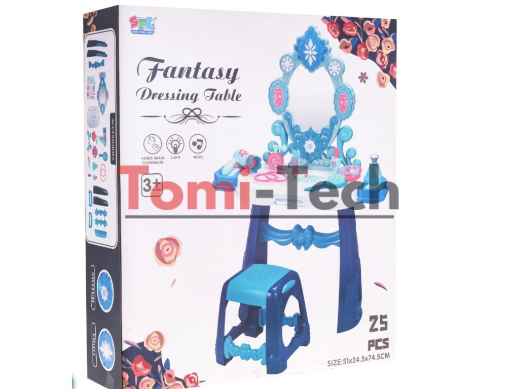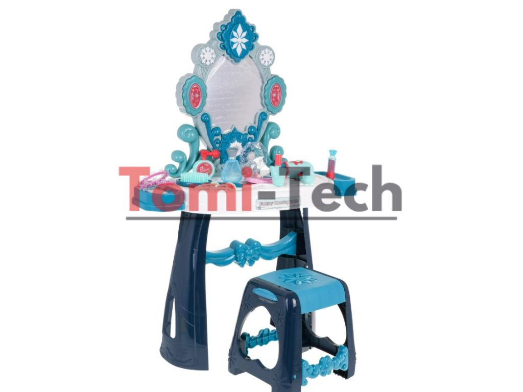 Interaktívny toaletný stolík so zrkadlom, taburetkou a doplnkami pre malú princeznú od troch rokov. Hračka má zvukovú a svetelnú funkciu (blikajúca hviezdička nad zrkadlom a dve hviezdičky po stranách zrkadla). Sada obsahuje fén, kefu a falošnú kozmetiku.
