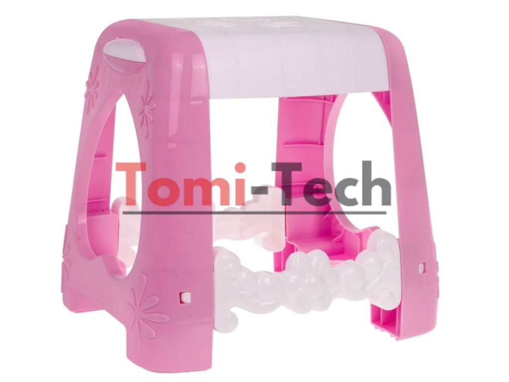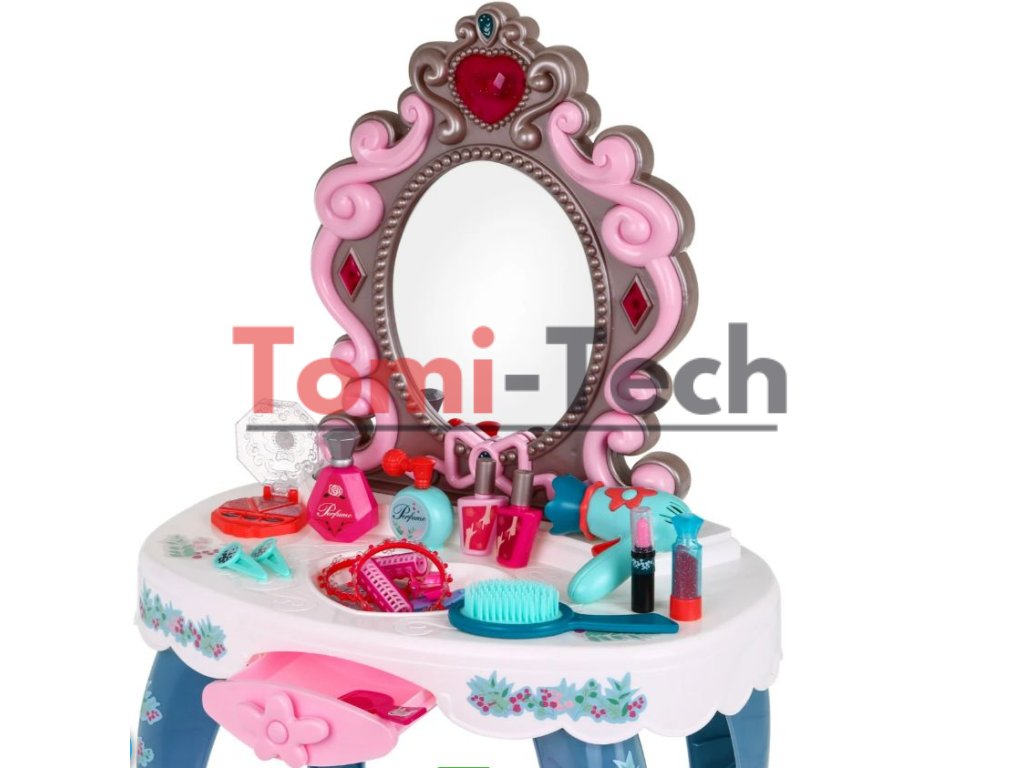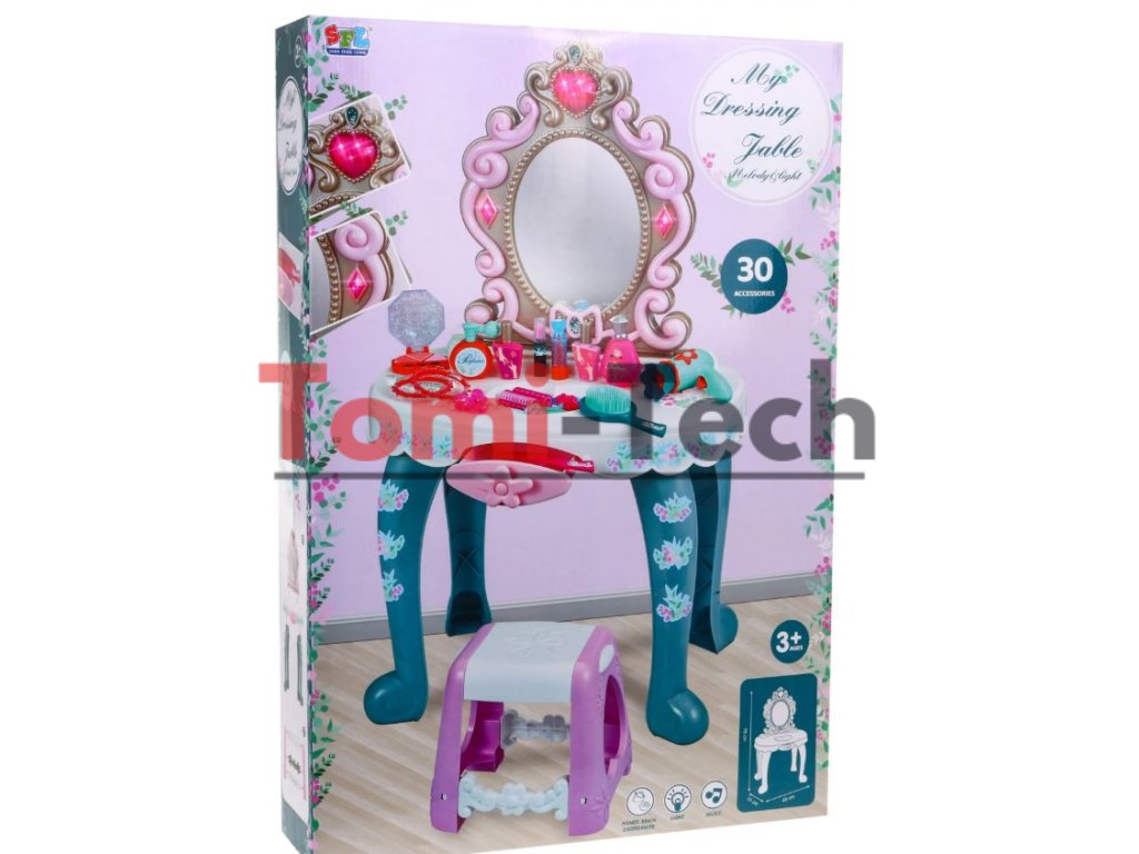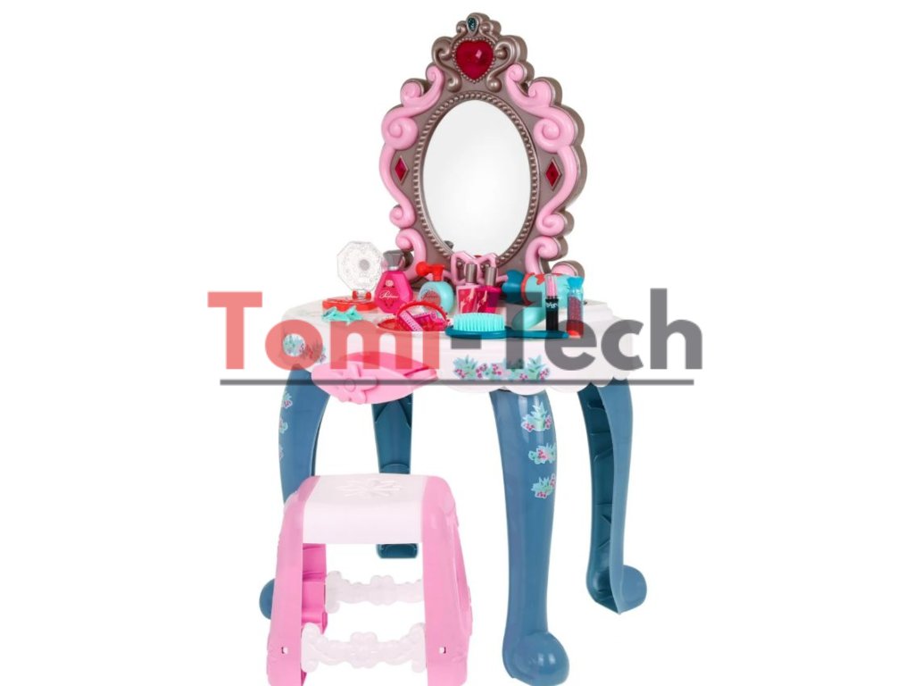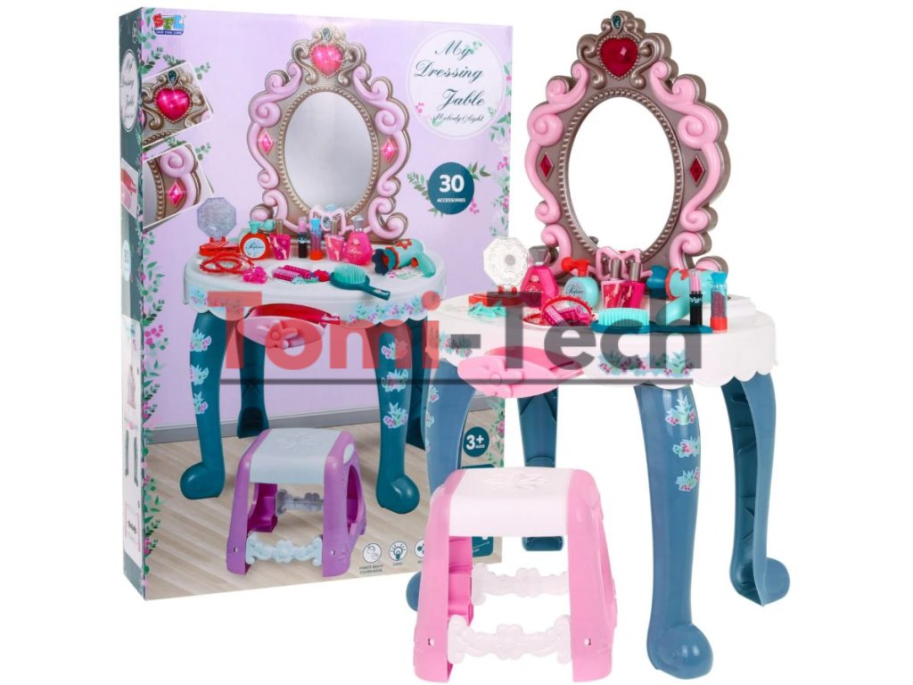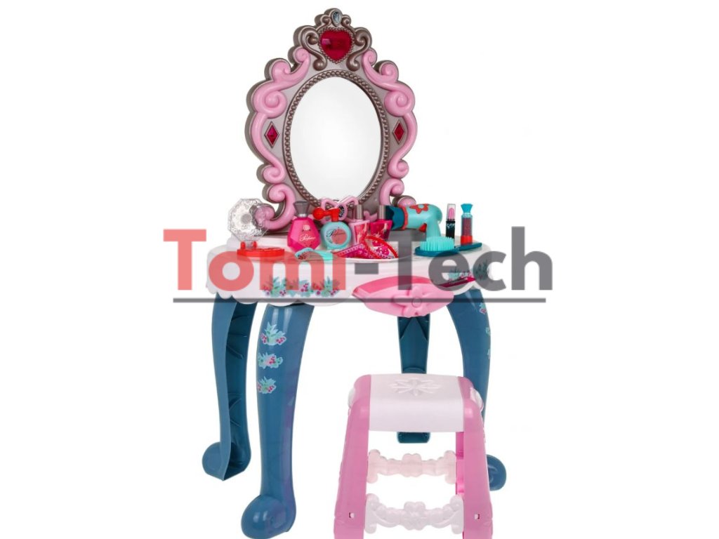 Interaktívny toaletný stolík so zrkadlom, taburetkou a doplnkami pre malú princeznú. Hračka má funkciu zvuku (tri melódie) a svetla (srdiečko nad zrkadlom a dva diamanty po stranách zrkadla). Všetka kozmetika v súprave je atrapa.
