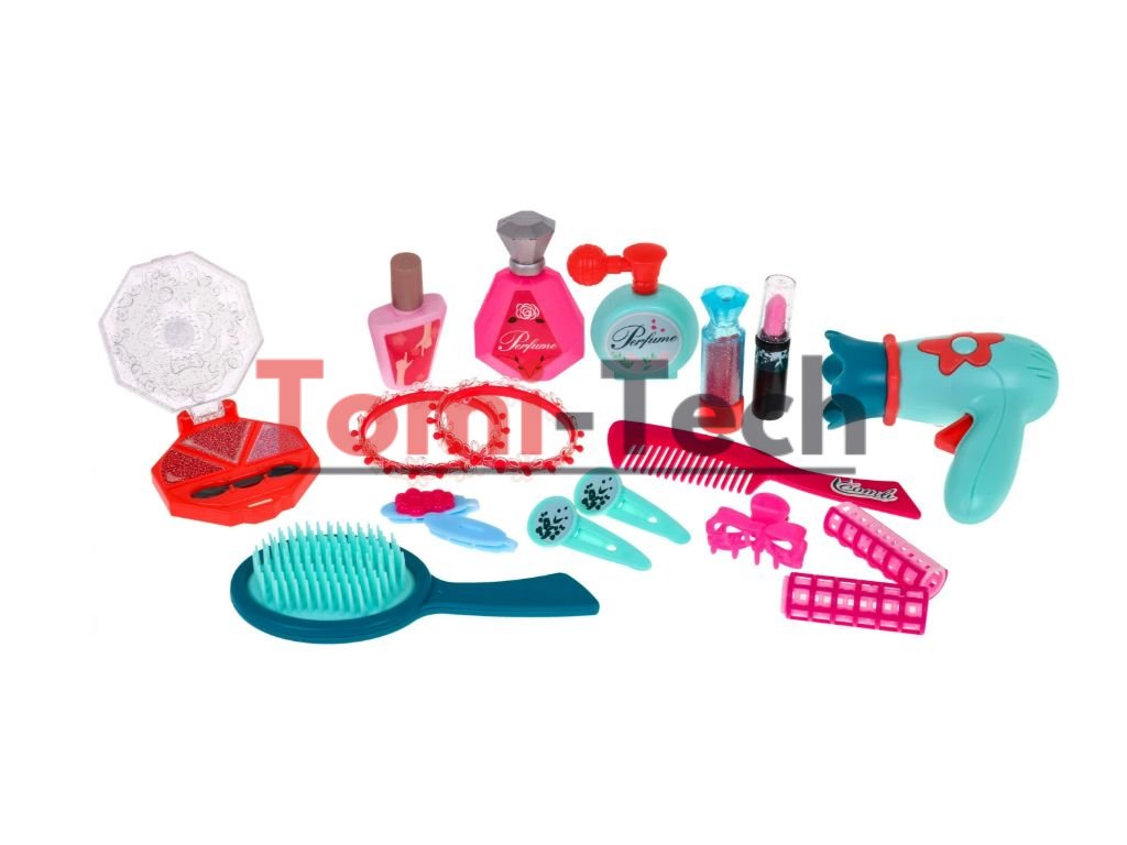 Obsah: toaletný stolík so zrkadlom a stoličkou,sušička, v ktorej po stlačení tlačidla počujete zvuk sušenia (sušička nevyžaduje batérie),kefa na vlasy,hrebeň,dva rúže ,dva laky na nechty,parfum s rozprašovačom,parfum v ozdobnom flakóne (plast),očné tiene ,dva náramky,dva natáčky na vlasy,päť sponiek do vlasov,dekoratívne nálepky