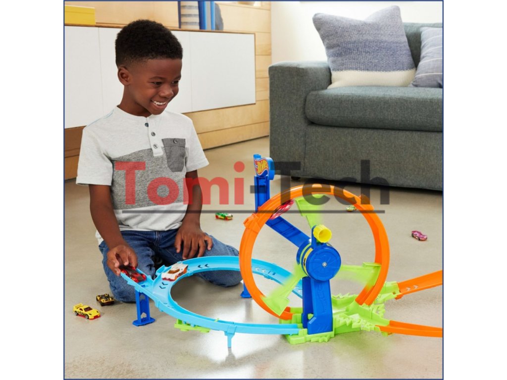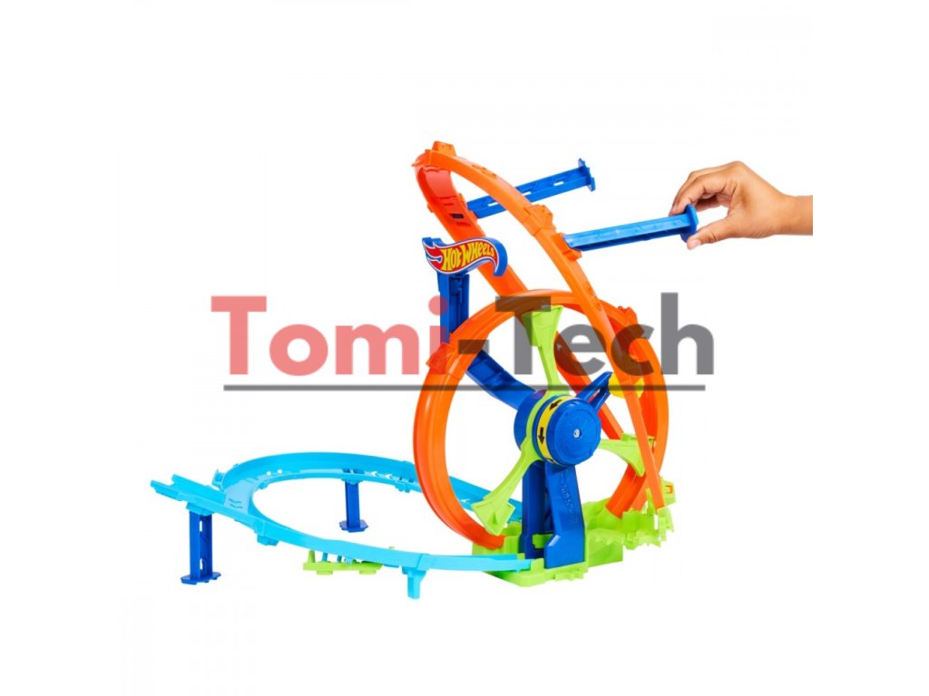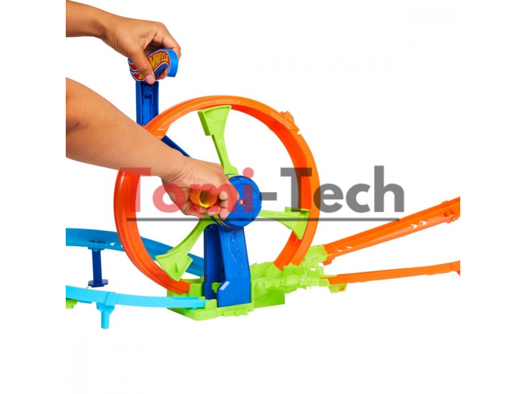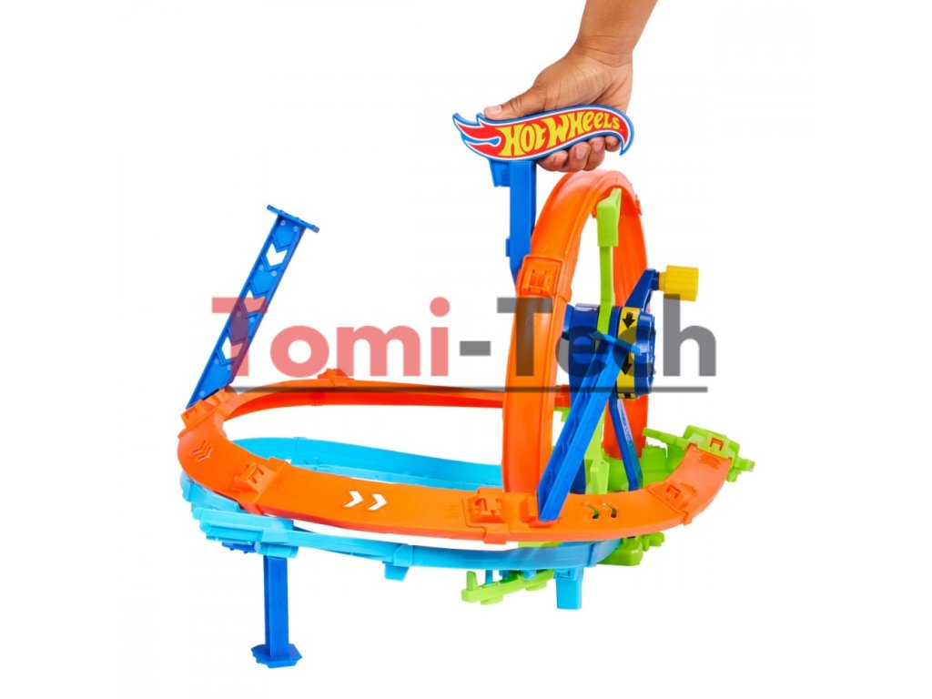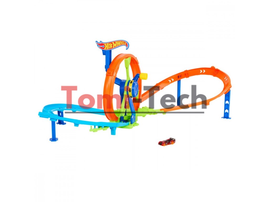 - Hracia sada Hot Wheels Turbo Loop Race obsahuje posilňovacie koleso ovládané kľukou, ktoré poháňa autíčka pretekať cez slučku, zákruty a nárazovú zónu znova a znova.