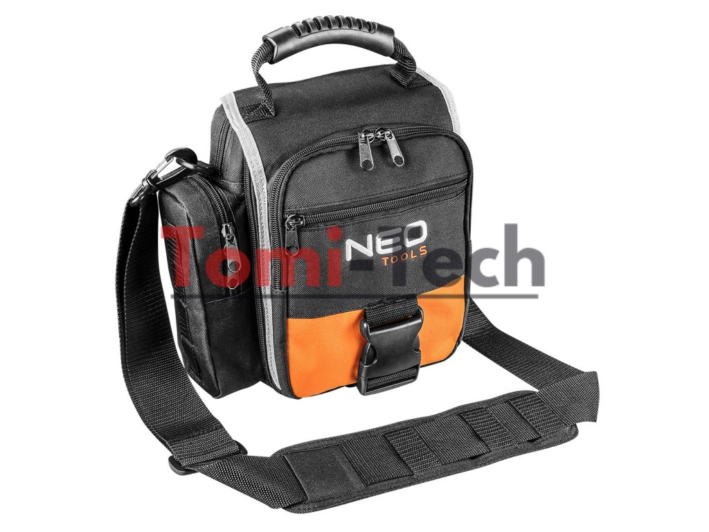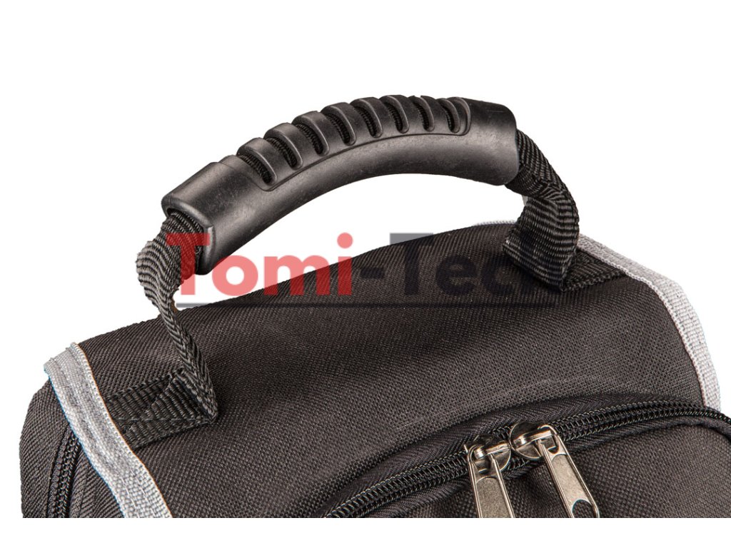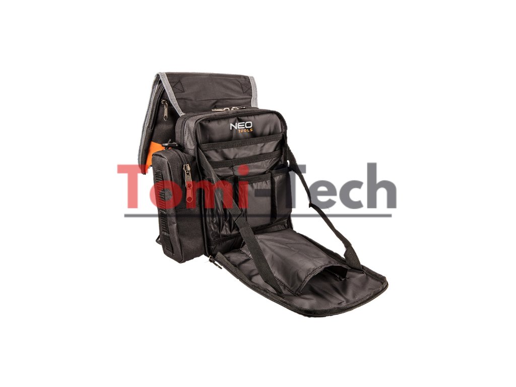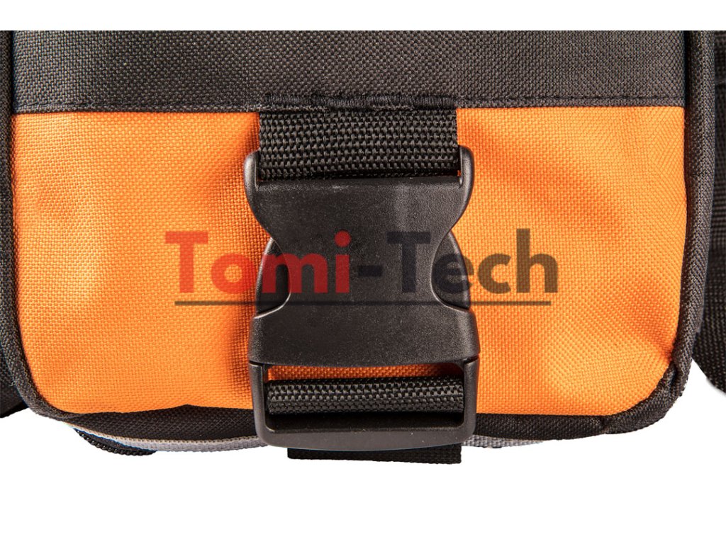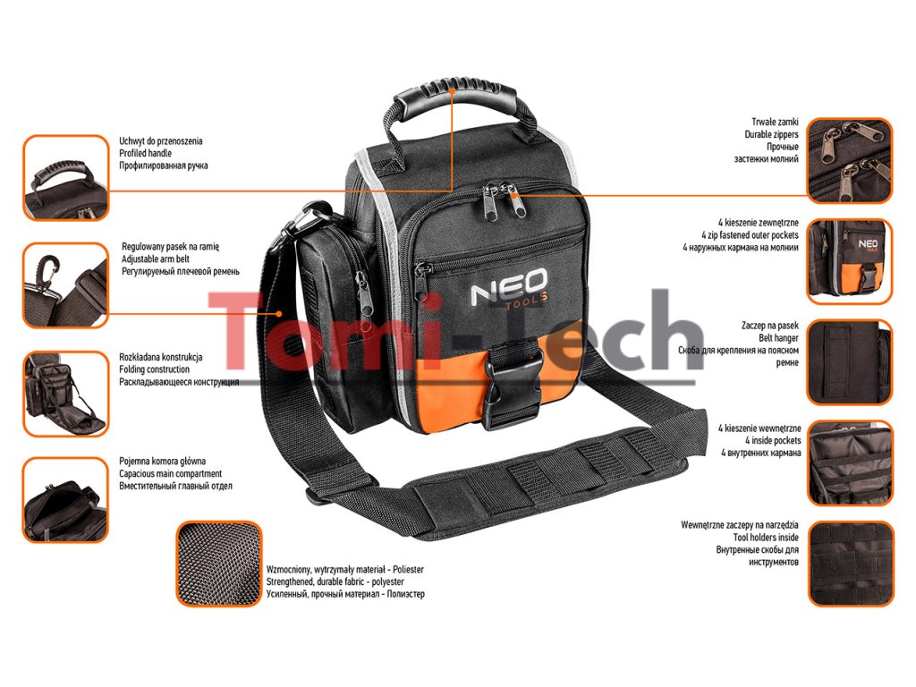 Taška na náradie z polyesteru, 4 vnútorné vrecká, 4 vonkajšie vrecká, skladacia konštrukcia, rukoväť na prenášanie, nastaviteľný popruh, háčiky na náradie, háčiky na opasok, pevné zipsyDodatočné parametre