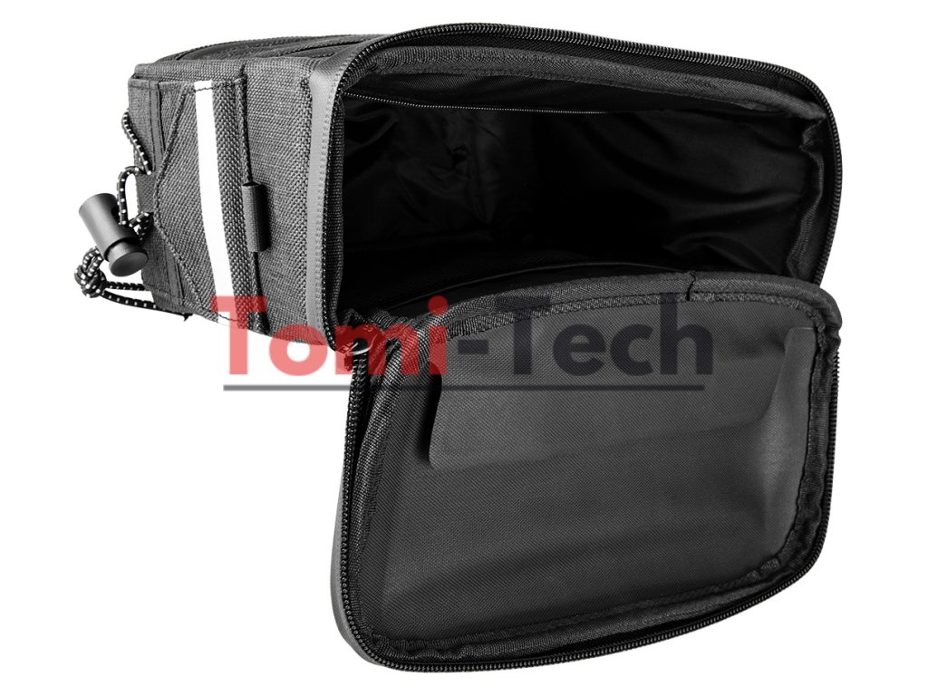 Taška na bicykel, dĺžka hore 23 cm, dĺžka dole 18 cm, šírka hore 12 cm, šírka dole 8 cm, výška 17 cm, vyrobená z 600D TPU polyesteru, vodeodolná, matné PVC vrecko na smartfón, veľké vrecko na zips, dve malé vrecká so zapínaním na suchý zips, v spodnej časti tašky je zamotaná gumička na pripevnenie napr. pumpy na bicykel, strieborné reflexné prvky, montáž tašky pomocou suchých zipsov, kombinovaný popruh umožňuje zavesiť tašku na rameno.Dodatočné parametre