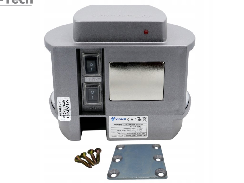 - Výkonný, energeticky úsporný ultrazvukový generátor s modulom automatickej zmeny frekvencie. Zariadenie vyžaruje premenlivý ultrazvuk, ktorý vytvára nepríjemné, neznesiteľné prostredie pre hlodavce, a tým im bráni v pobyte a usadzovaní sa v blízkosti chráneného priestoru.