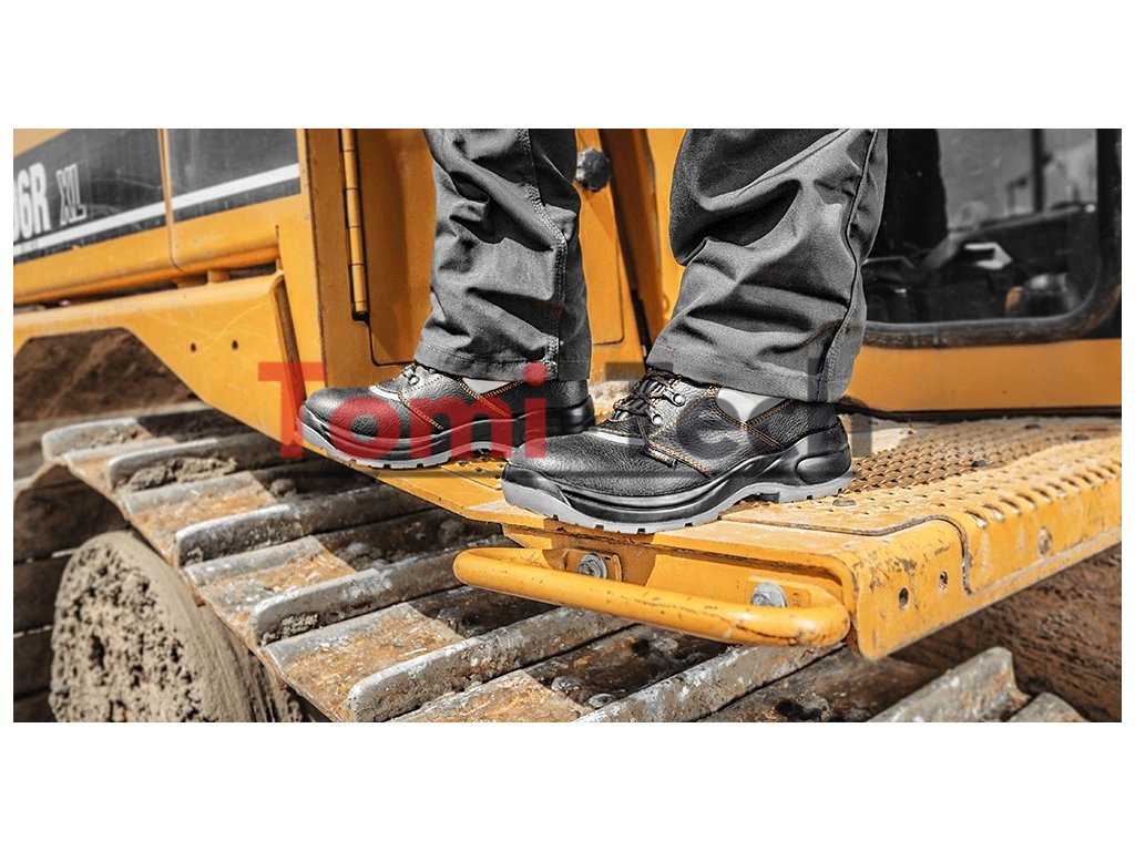 Pracovné topánky, kožené, veľkosť 43, protišmyková podrážka s tlmiacim systémom, odolné voči oderu, olejom, benzínu a iným organickým rozpúšťadlám, oceľová špička odoláva nárazu do 200 J, oceľová vložka proti prepichnutiu, antistatická vložka, kovové pútka, reflexné zóny, obuv vyrobená v kategórii S1P SRA (SRA - odolnosť proti pošmyknutiu na keramickej podlahe pokrytej roztokom laurylsulfátu sodného (SLS)), certifikát CEDodatočné parametre