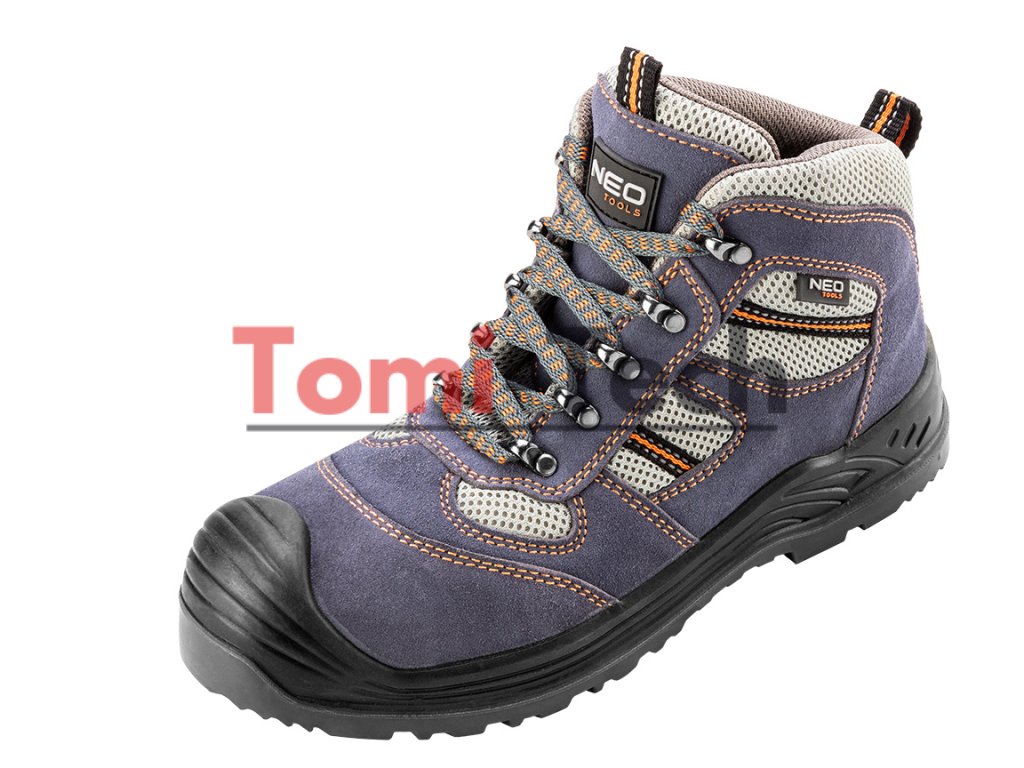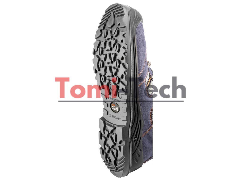 Semišové pracovné topánky, veľkosť 46, protišmyková podrážka s tlmiacim systémom, odolné voči oderu, olejom, benzínu a iným organickým rozpúšťadlám, oceľová špička odoláva nárazu do 200 J, oceľová vložka proti prepichnutiu, antistatická vložka, kovové pútka, priedušný materiál, obuv vyrobená v kategórii S1P SRA (SRA - odolnosť proti pošmyknutiu na keramickej podlahe pokrytej roztokom laurylsulfátu sodného (SLS)), certifikát CEDodatočné parametre