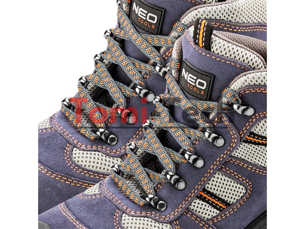 Semišové pracovné topánky, veľkosť 47, protišmyková podrážka s tlmiacim systémom, odolné voči oderu, olejom, benzínu a iným organickým rozpúšťadlám, oceľová špička odoláva nárazu do 200 J, oceľová vložka proti prepichnutiu, antistatická vložka, kovové pútka, priedušný materiál, obuv vyrobená v kategórii S1P SRA (SRA - odolnosť proti pošmyknutiu na keramickej podlahe pokrytej roztokom laurylsulfátu sodného (SLS)), certifikát CEDodatočné parametre