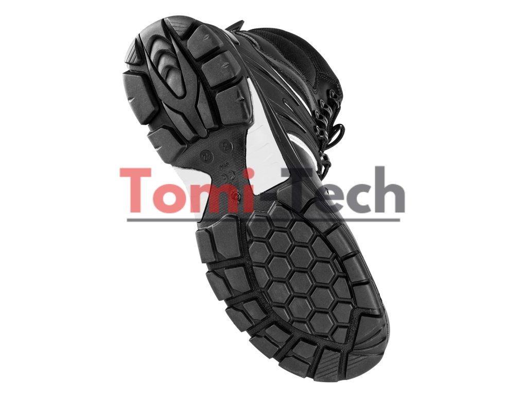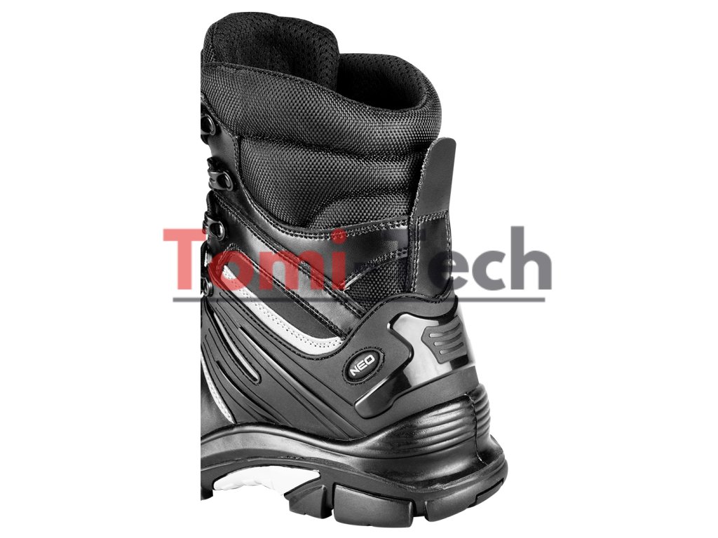 Pracovná obuv s vysokým zvrškom, trieda S3 SRC, dvojmateriálový zvršok z polyuretánovou usňou (ľahká pena) a oxfordskej tkaniny, podšívka: nepremokavá membránová vložka, kovové slučky, reflexné prvky, profilovaná zadná časť, kompozitná špička poskytujúca ochranu pred nárazmi s energiou 200 J, uzavretá päta, zosilnená pätová časť, kevlarová vložka proti prepichnutiu, dvojmateriálová podrážka; odolnosť voči olejom, benzínu a iným organickým rozpúšťadlám; antistatické vlastnosti; absorpcia energie v oblasti päty; protišmyková úprava na keramickom povrchu potiahnutom roztokom laurylsulfátu sodného (SLS) a na oceľovom povrchu potiahnutom glycerolom; zvýšené parametre odolnosti voči prenikaniu a nasiaknutiu podľa klasifikácie bezpečnostnej obuvi podľa normy EN ISO 20345, veľkosť 45Dodatočné parametre