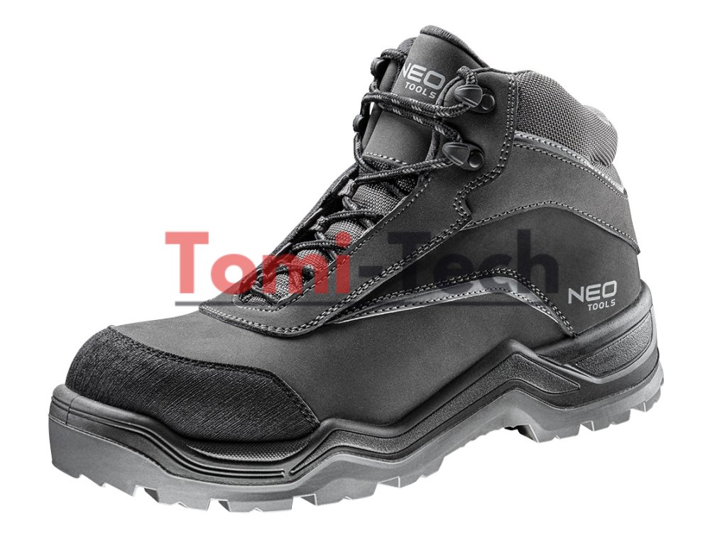 Pracovná obuv S3L SR FO, bez kovových prvkov, veľkosť 43, nubuková, zvýšená odolnosť voči premočeniu a nasiaknutiu, reflexné prvky, protišmyková podrážka s tlmiacim systémom, odolná voči oderu, olejom, benzínu a iným organickým rozpúšťadlám, dvojhustotná PU podrážka, sklolaminátová špička odoláva nárazom až do 200 J, kevlarová stielka proti prepichnutiu, antistatická stielka, šnúrky s votkanou reflexnou niťou, špička zaistená dodatočnou ochrannou vrstvou, päta a jazyk vystužené oxfordskou tkaninou, obuv vyrobená v kategórii S3L SR FO (SR - odolnosť voči pošmyknutiu na keramickom povrchu potiahnutom roztokom laurylsulfátu sodného (SLS) a na oceľovom povrchu potiahnutom glycerolom), certifikát CEDodatočné parametre